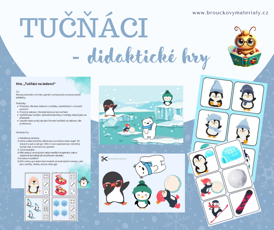 Tento soubor obsahuje různé didaktické hry a aktivity s motivem tučňáků. Zaměřuje se na rozvoj předmatematických dovedností, zrakového vnímání, prostorové orientace, paměti a dalších klíčových oblastí. Materiály jsou připravené k tisku a snadno využitelné v mateřských školách.