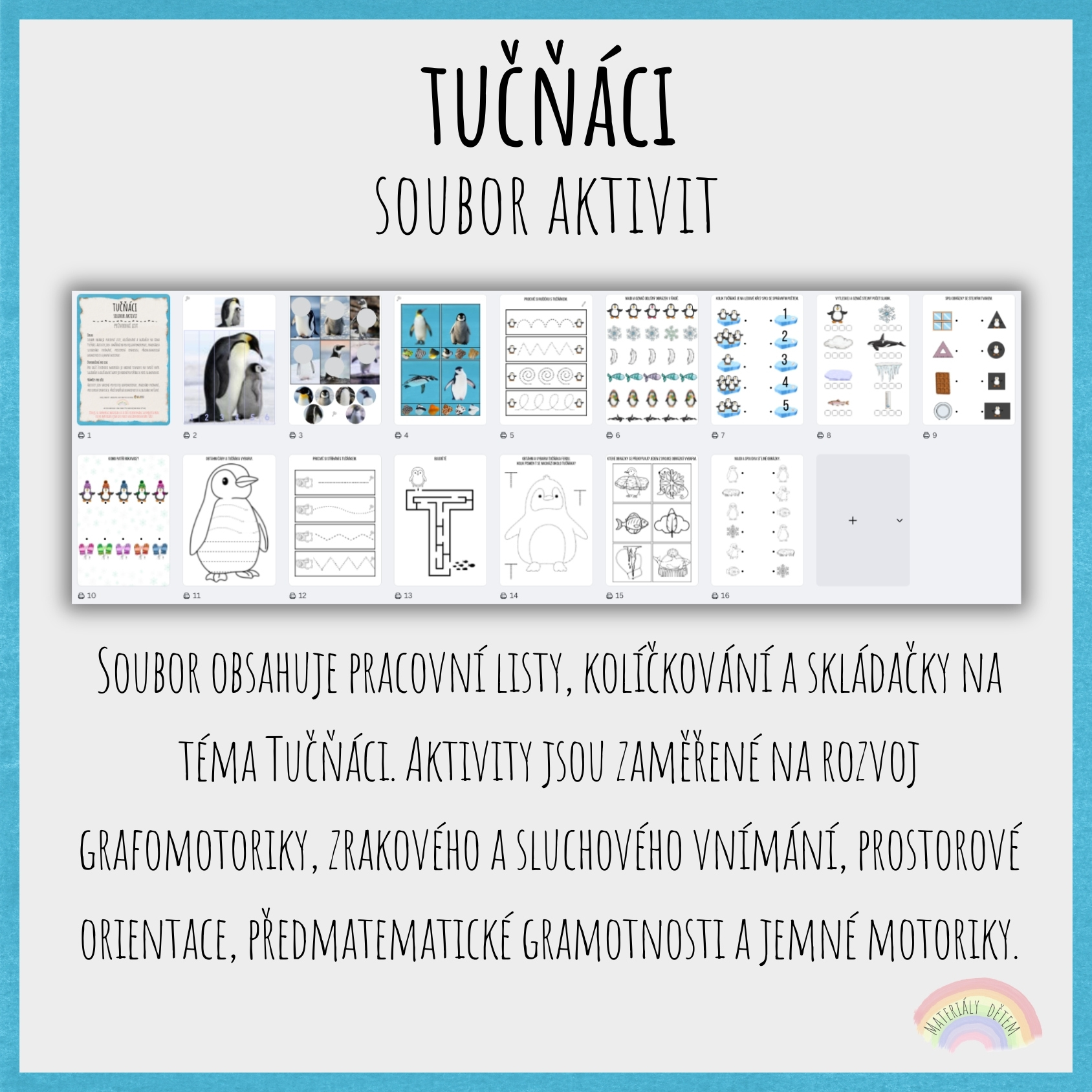 Soubor obsahuje pracovní listy, kolíčkování a skládačky na téma Tučňáci. Aktivity jsou zaměřené na rozvoj grafomotoriky, zrakového a sluchového vnímání, prostorové orientace, předmatematické gramotnosti a jemné motoriky.