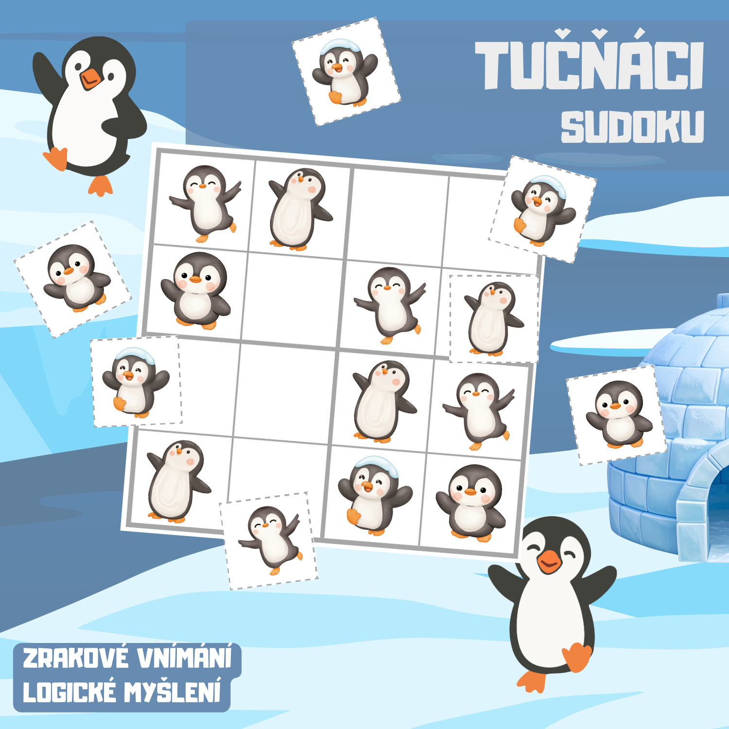 - 140 malých kartiček s obrázky tučňáků.