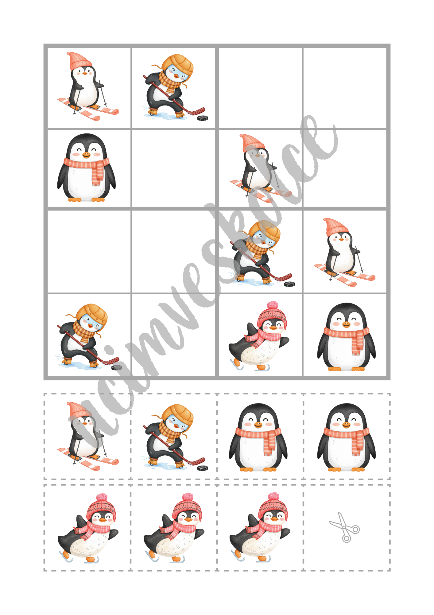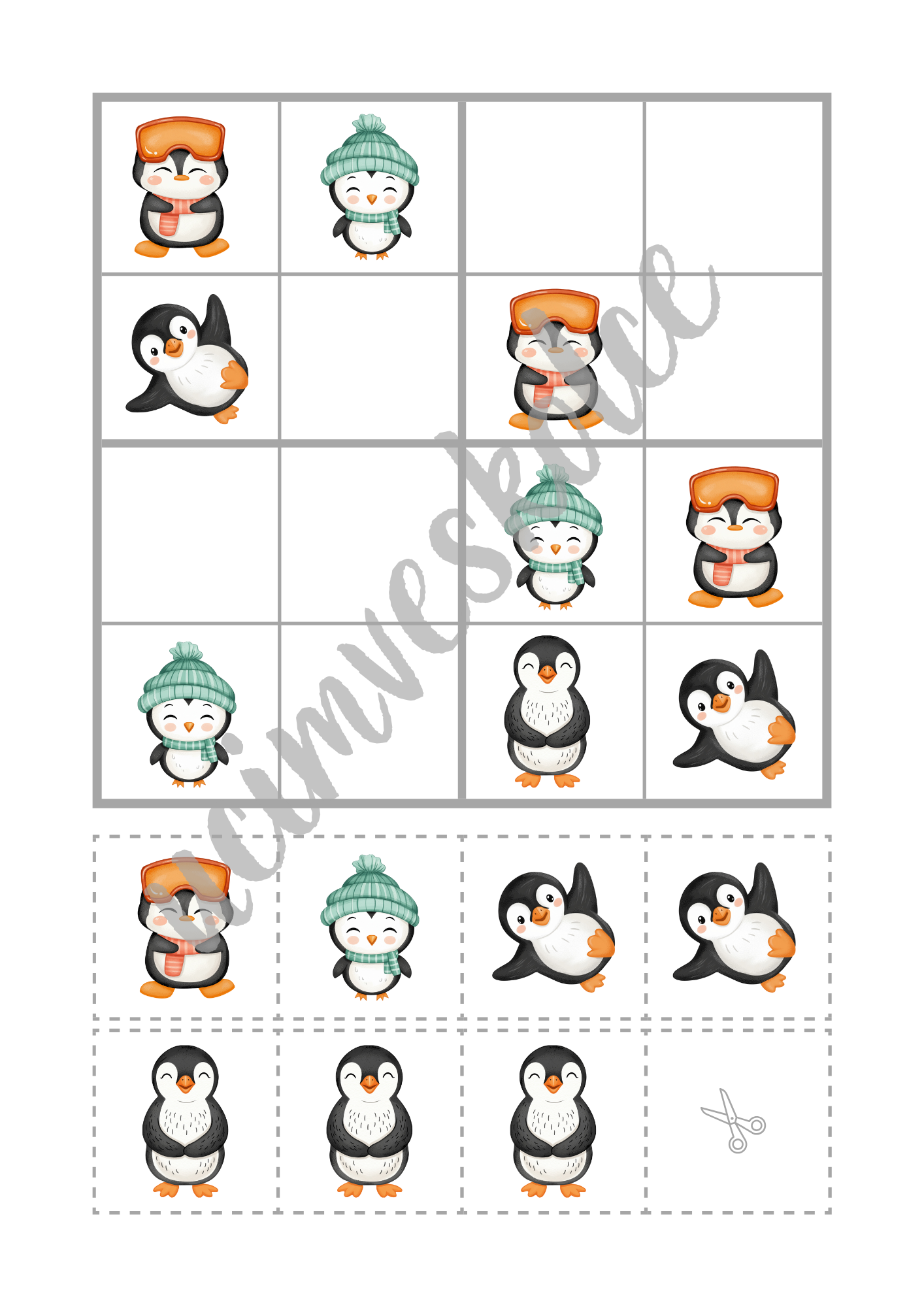 Soubor můžete též využít jako pracovní sešit / pracovní listy / brožuru - děti mohou vystřihnout pouze malé kartičky ze spodní části listu a nalepit je do sudoku tabulky v horní části listu nebo chybějící obrázky dokreslit / domalovat.
