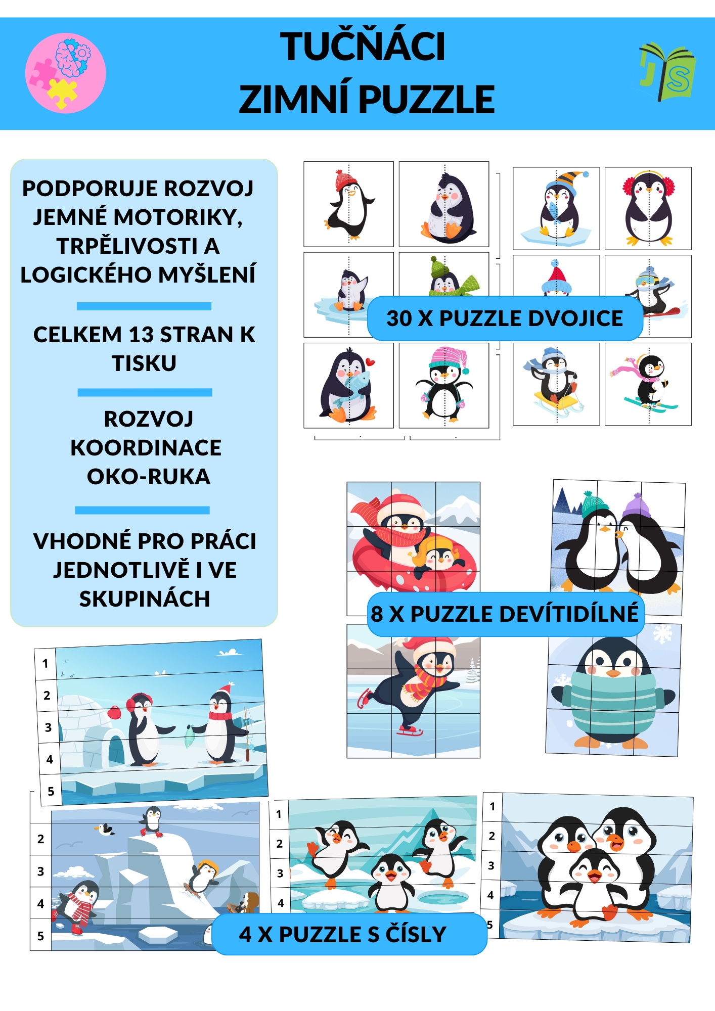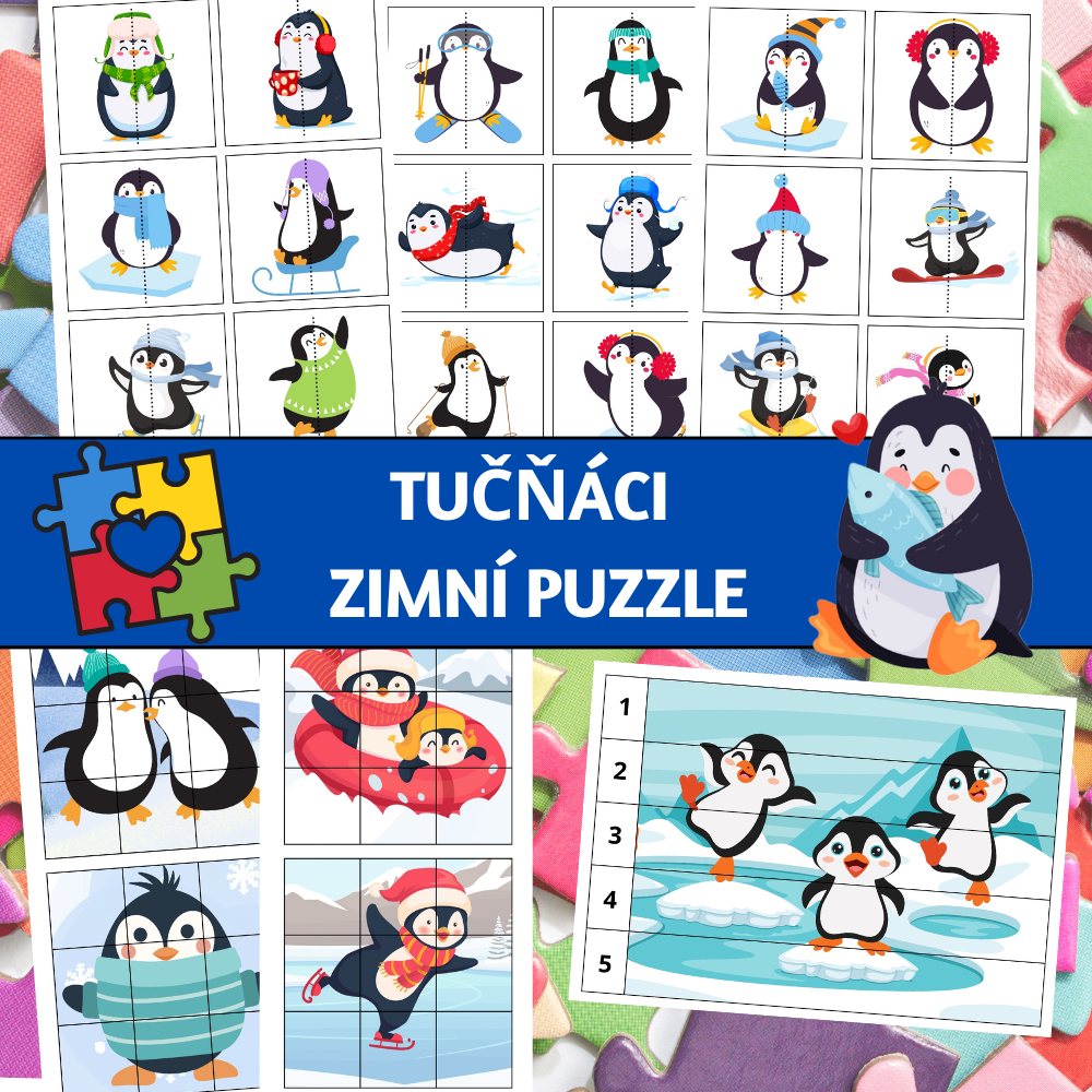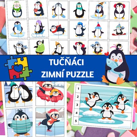 Zimní puzzle aktivita s tučňáky pro rozvoj jemné motoriky, vizuální percepce, pozornosti a logického myšlení. Materiál obsahuje tři úrovně obtížnosti: 30 puzzle dvojic pro hledání shod, 8 devítidílných puzzle a 4 puzzle s čísly (1–5), díky kterým děti skládají obrázek podle správného pořadí. Vhodné pro individuální práci, centra aktivit, ranní práci i speciální pedagogiku.