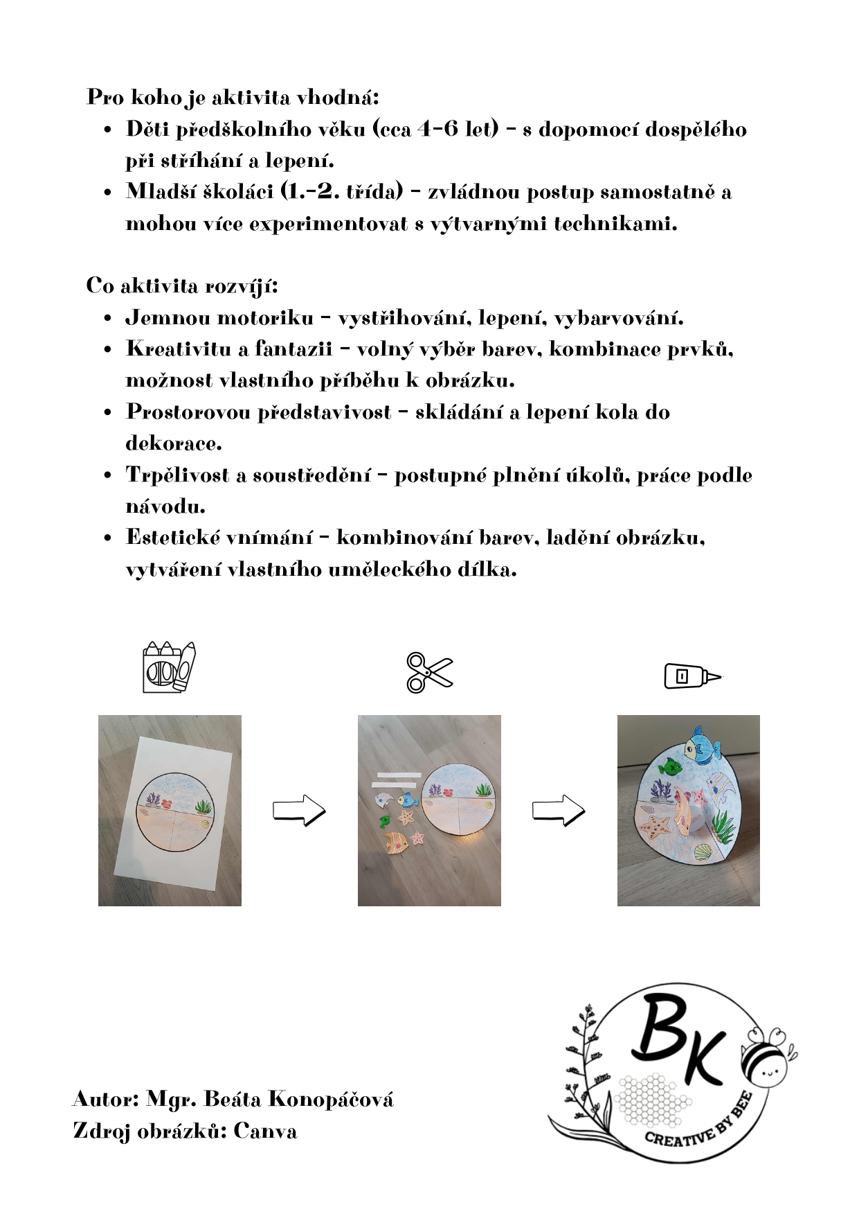 Aktivita rozvíjí fantazii, jemnou motoriku, trpělivost i tvořivost. Děti se naučí kombinovat barvy, zkoušet různé výtvarné techniky a vytvoří si vlastní originální koláž.