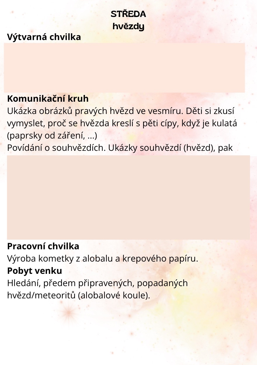 Aktivity ke komunikačním kruhům, výtvarné a pracovní chvilky, pohybové aktivity, samostatnou práci pro dětí (centra aktivit), autorskou pohádku a básničku a vše potřebné k daným aktivitám.