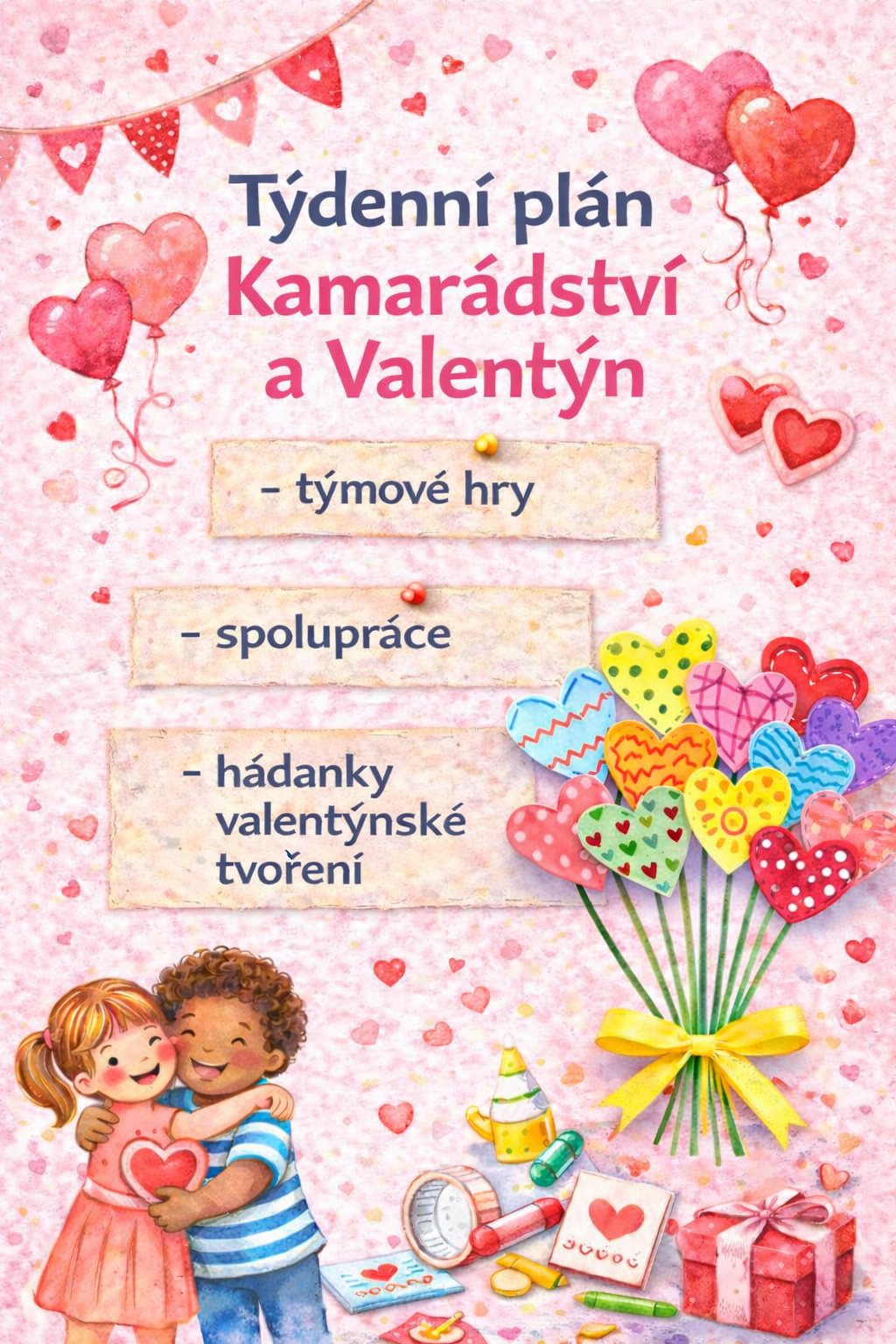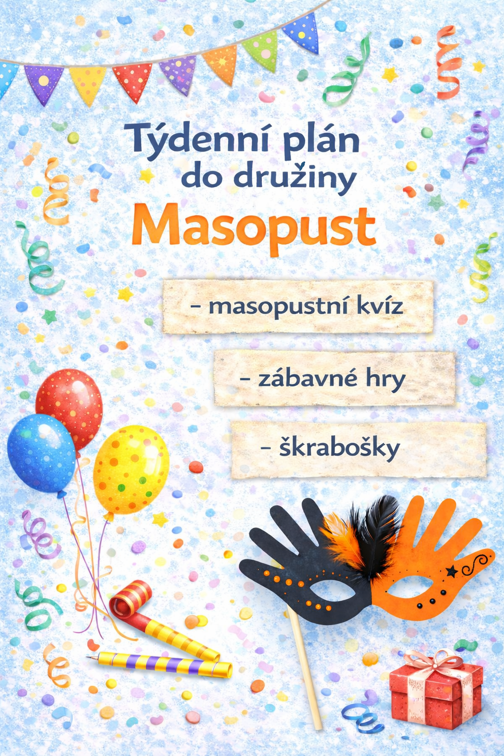 🎯 Obsahuje 4 zpracované týdny s programem na každý den: Hromnice, Kamarádi a Valentýn, Masopust, Týden zábavných her a aktivit + masopustní stezku / kvíz ven i dovnitř
