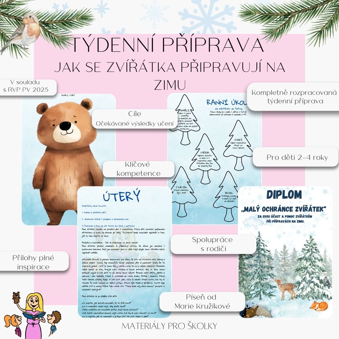 Příprava zahrnuje detailně popsané aktivity na celý týden, zaměřené na lesní zvířata, jako jsou medvědi, veverky, ježci a ptáčci. Děti se dozví, kde zvířátka v zimě přespávají, jak si sbírají zásoby na chladné období, a jak jim lidé mohou pomoci přežít zimu. Součástí přípravy jsou pohybové aktivity, které rozvíjejí jemnou i hrubou motoriku, například skákání jako veverky nebo plazení jako ježci. Děti se také seznámí s příběhy o zvířátkách, budou zpívat písničky a recitovat jednoduché básničky, které podporují rozvoj jejich řečových dovedností.