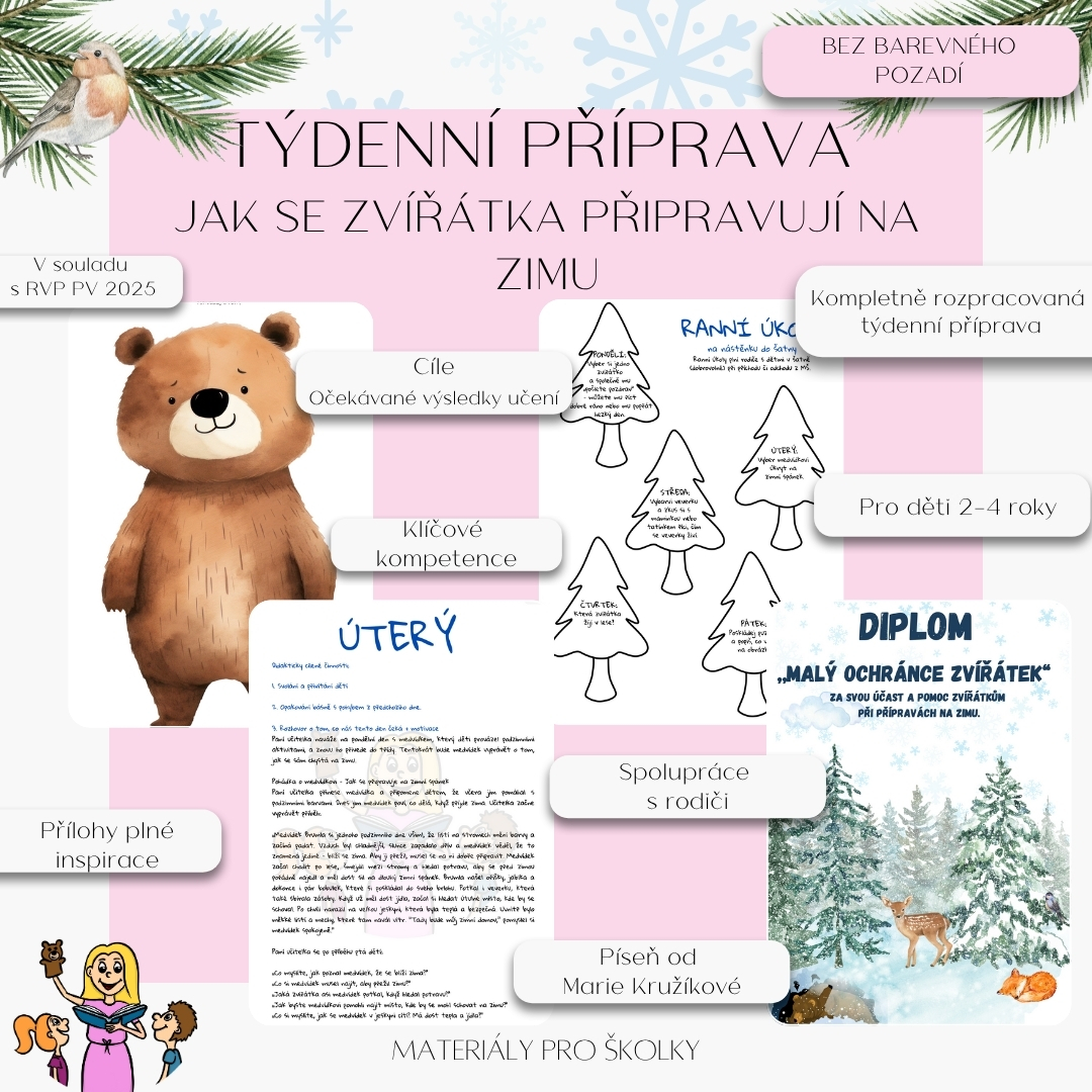 Příprava zahrnuje detailně popsané aktivity na celý týden, zaměřené na lesní zvířata, jako jsou medvědi, veverky, ježci a ptáčci. Děti se dozví, kde zvířátka v zimě přespávají, jak si sbírají zásoby na chladné období, a jak jim lidé mohou pomoci přežít zimu. Součástí přípravy jsou pohybové aktivity, které rozvíjejí jemnou i hrubou motoriku, například skákání jako veverky nebo plazení jako ježci. Děti se také seznámí s příběhy o zvířátkách, budou zpívat písničky a recitovat jednoduché básničky, které podporují rozvoj jejich řečových dovedností.