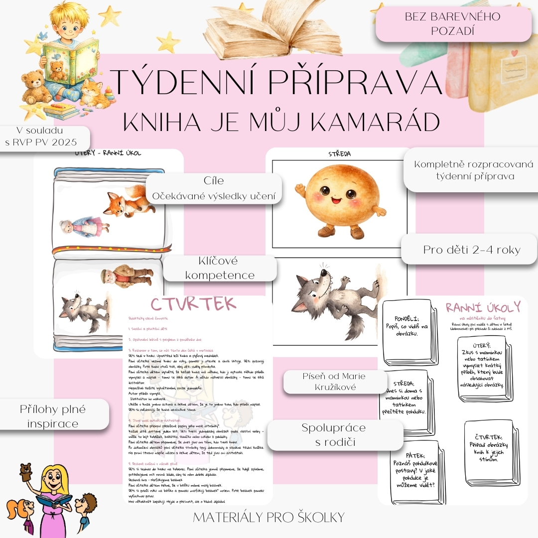 Tato týdenní příprava provede děti světem knih hravou, přirozenou a věkově přiměřenou formou. Děti postupně objevují, že kniha není jen předmět, ale brána do světa pohádek, postav a fantazie.