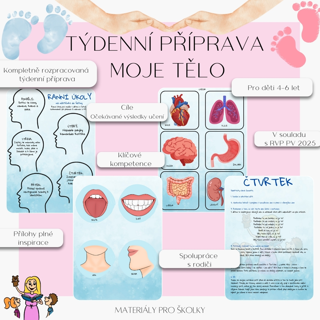 Všechny materiály jsou připraveny k okamžitému použití. Učitelé najdou v přípravě plán na celý týden, který jim usnadní práci a poskytne dětem bohaté zážitky spojené s poznáváním vlastního těla.