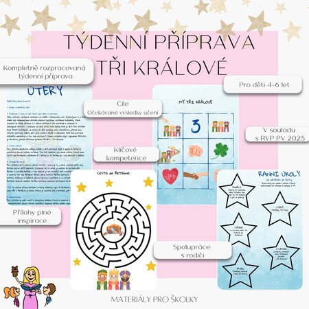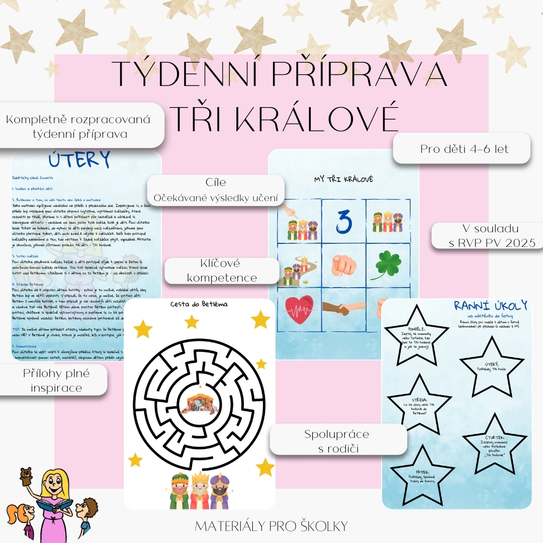 Tato příprava je kompletním průvodcem na týden plný zábavy a objevování tradice Tří králů. Všechny materiály a šablony jsou připravené k okamžitému použití a přinášejí do třídy radostnou atmosféru plnou nových podnětů. Nechte děti poznat příběh Kašpara, Melichara a Baltazara a užijte si s nimi kouzelný začátek nového roku!