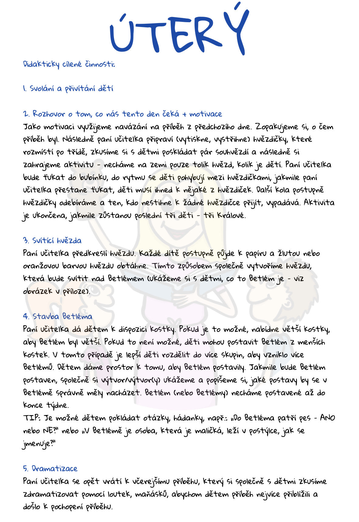 Děti se naučí naslouchat příběhům, zpívat písničky spojené s touto tradicí a vyjadřovat své myšlenky a pocity. Pomocí výtvarných aktivit budou rozvíjet tvořivost a estetické vnímání, zatímco interaktivní hry a skupinové úkoly posílí jejich sociální dovednosti a schopnost spolupracovat s ostatními. Součástí přípravy jsou také ranní úkoly, které podporují zapojení rodičů, a různé aktivity na ven, jako je procházka k Betlému.