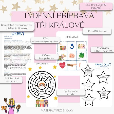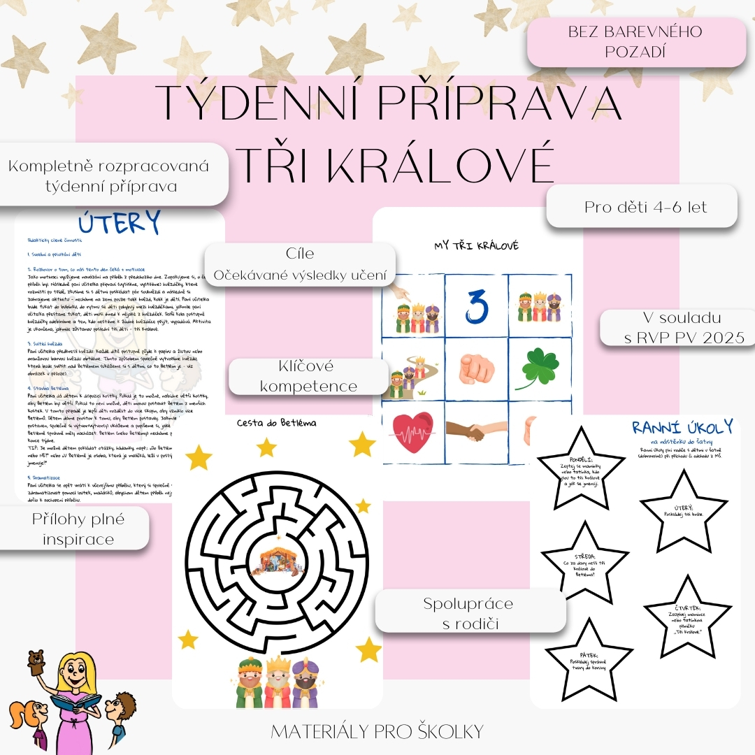 Tato příprava je kompletním průvodcem na týden plný zábavy a objevování tradice Tří králů. Všechny materiály a šablony jsou připravené k okamžitému použití a přinášejí do třídy radostnou atmosféru plnou nových podnětů. Nechte děti poznat příběh Kašpara, Melichara a Baltazara a užijte si s nimi kouzelný začátek nového roku!