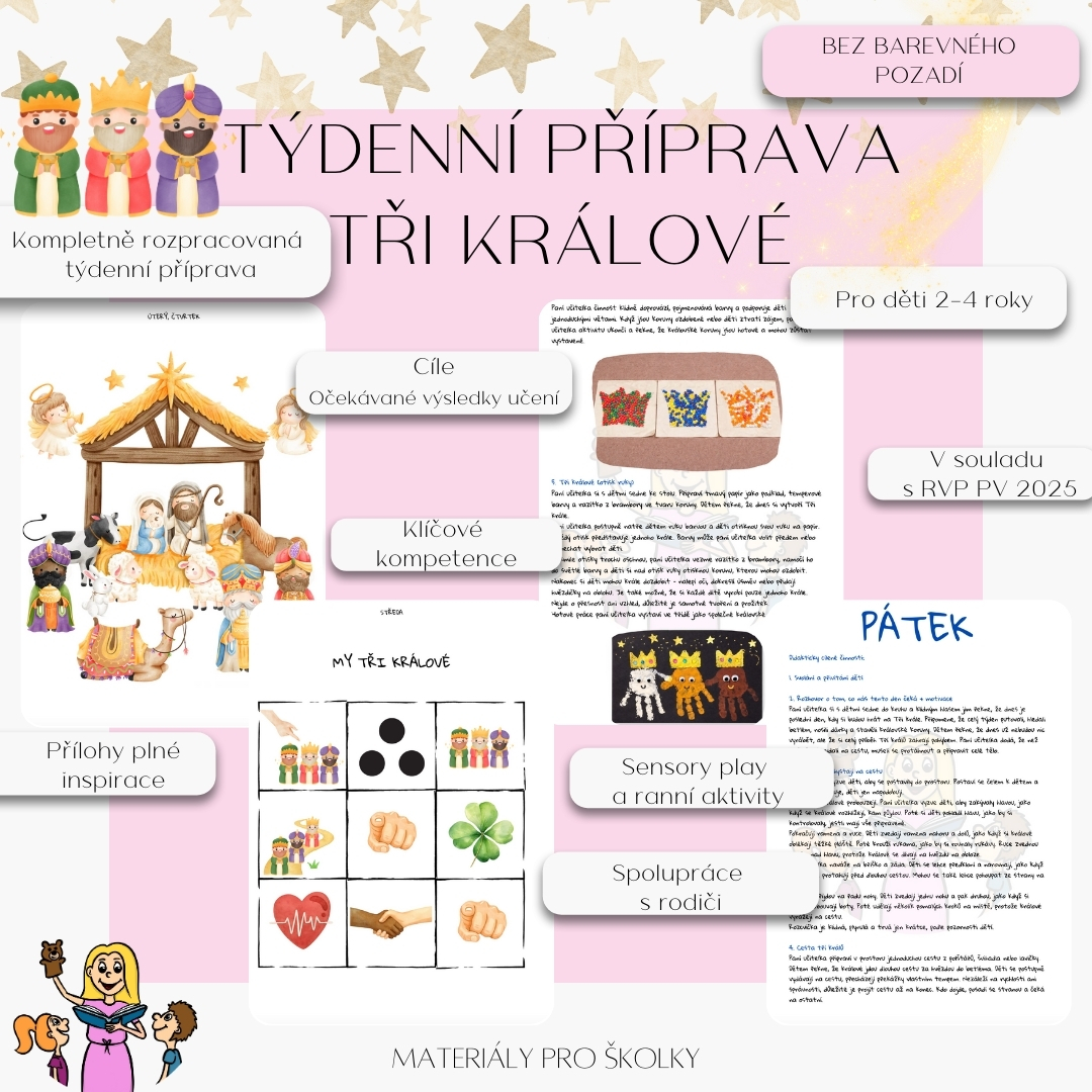 Soubor obsahuje: - cíle, očekávané výsledky učení, klíčové kompetence, základní gramotnosti a pedagogické strategie dle RVP PV 2025- pondělí-pátek kompletně zpracovaná příprava- ranní úkoly pro rodiče s dětmi- návrh na zapojení rodičů- ranní aktivity, aktivity na ven- návrhy na sensory play- básnička- omalovánky- přílohyTato týdenní příprava na téma Tři králové je vytvořená přímo pro děti ve věku 2–4 roky. Respektuje jejich tempo, potřebu pohybu, smyslového objevování i krátké doby soustředění. Nečekejte složité úkoly ani pracovní listy – naopak klidné, hravé a smysluplné aktivity, které děti baví a dávají jim smysl.Celý týden je logicky vystavěný od pondělí do pátku, s jasným vedením, co a jak s dětmi dělat. Příprava je psaná praktick, takže ji můžete rovnou vzít a použít, bez dalšího vymýšlení.Velkou roli v přípravě hrají také sensory play aktivity, ranní činnosti a pobyt venku. Nechybí ani zapojení rodičů, aby téma žilo i mimo třídu. Vše je nastavené tak, aby děti mohly objevovat svět přirozeně – rukama, očima, pohybem i hrou.Co v souboru najdete:cíle, očekávané výsledky učení, klíčové kompetence, základní gramotnosti a pedagogické strategie dle RVP PV 2025kompletně zpracovanou přípravu na celý týden (pondělí–pátek)ranní úkoly pro rodiče s dětminávrh na zapojení rodičůranní aktivity a aktivity na vennávrhy na sensory playbásničku, omalovánky a přílohyTato příprava je ideální pro mateřské školy i dětské skupiny, které chtějí smysluplně pracovat s tématem Tří králů, ale zároveň respektovat věk a potřeby nejmenších dětí.👉 Pokud hledáte hotovou, promyšlenou a opravdu použitelnou týdenní přípravu, tohle je ona.Soubor obsahuje 59 stran.