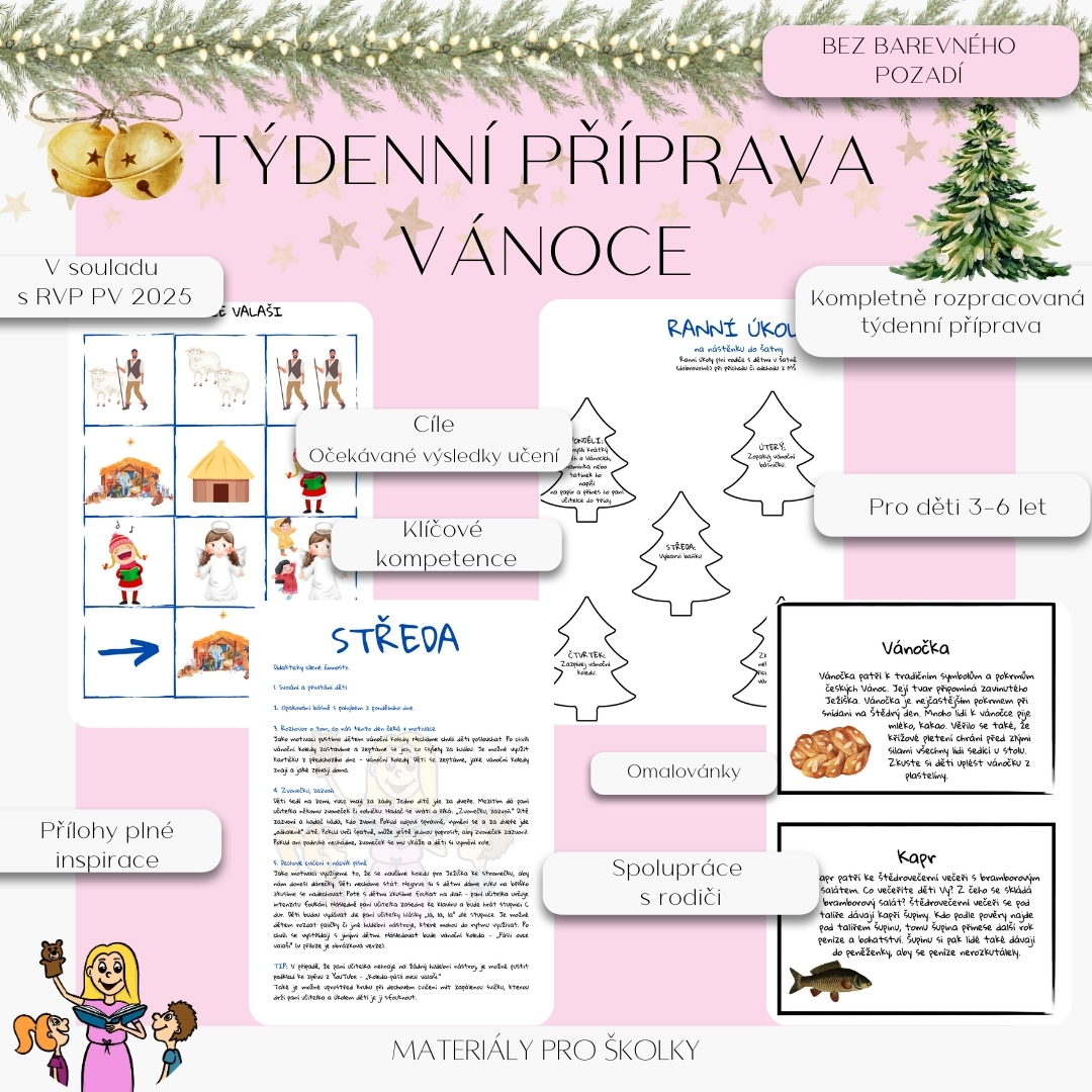 Připravte se na kouzelné období Vánoc s materiálem „Vánoce“, určeným pro učitele mateřských škol. Tento komplexní soubor aktivit přibližuje dětem vánoční tradice prostřednictvím smyslových, pohybových a tvořivých činností. Učitelé zde naleznou podrobný týdenní plán, který zahrnuje rozvíjení jemné i hrubé motoriky prostřednictvím tvořivých aktivit, podporu smyslového vnímání a poznávání vánočních tradic. Součástí jsou také podněty k rozvoji komunikačních dovedností dětí formou příběhů a říkanek, a tvořivé činnosti, jako je výroba adventních věnců, ozdob a dalších dekorací.