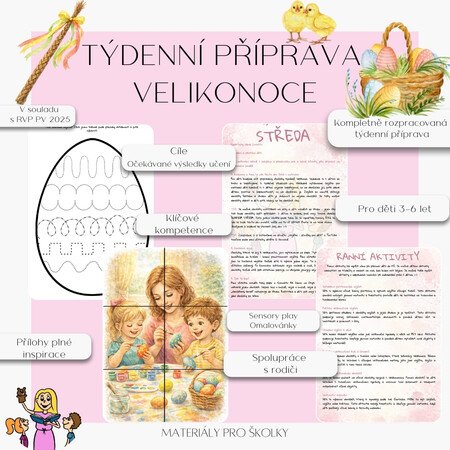 Součástí materiálu jsou také pracovní listy, omalovánky, sensory play, hry a návrhy na aktivity, které děti vtáhnou do světa Velikonoc a umožní jim pochopit význam tohoto krásného období. Děti budou mít možnost zapojit se do tradičních velikonočních her a vytvářet dekorace, které mohou vzít domů.