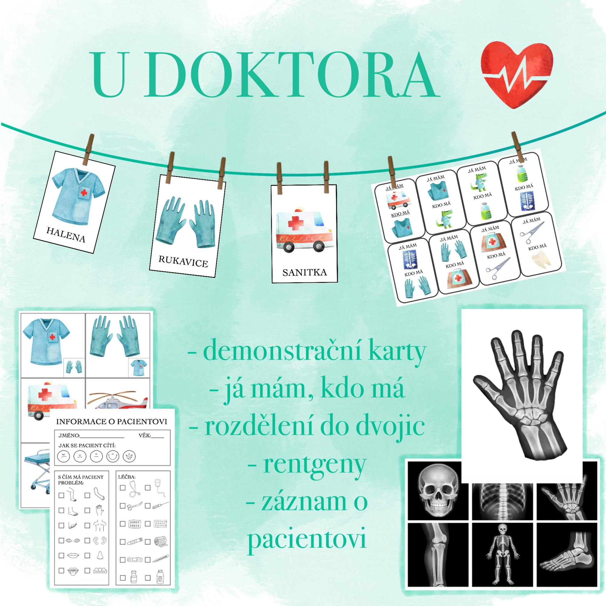 - demonstrační karty (doktor, nemocnice) - najdete zde 3 velikosti karet (8 na stránce, 4 na stránce a 2 na stránce), celkem 24 karet, děti se seznamují s obrázky a rozšiřují slovní zásobu