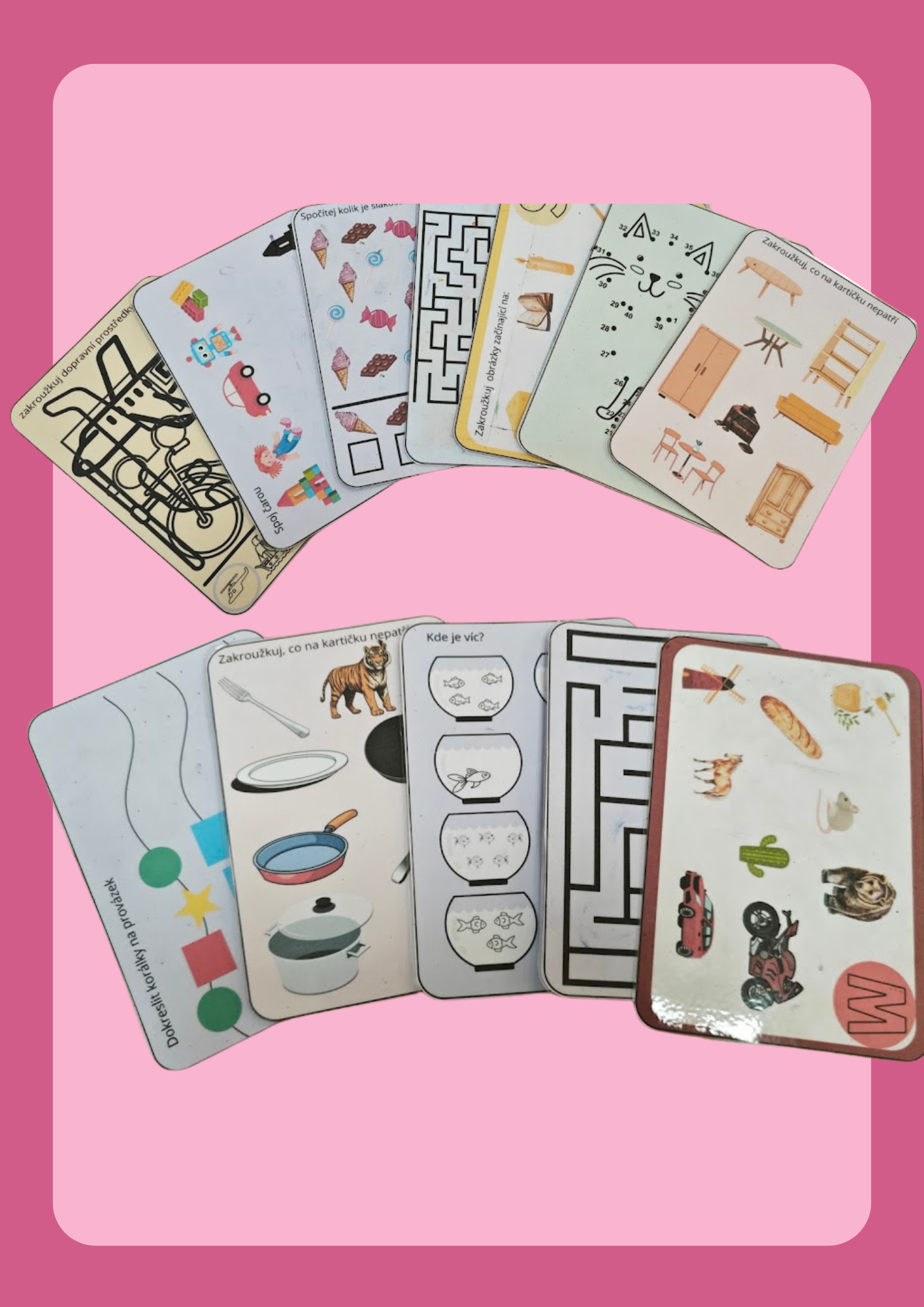 Soubor stačí vytisknout, zalaminovat a používat opakovaně se stíratelnými fixy. Kartičky jsou ideální pro samostatnou práci, ranní centra, koutky aktivit i individuální rozvoj.