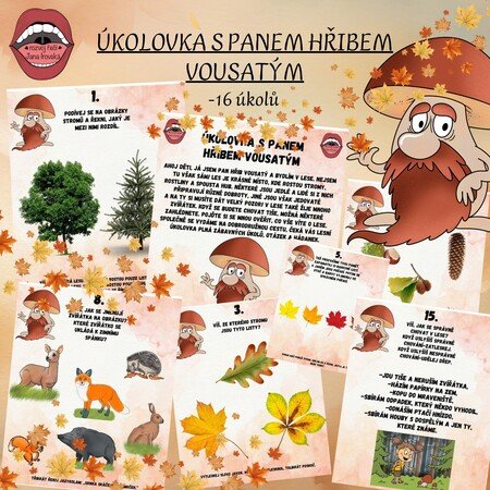 Úkolovka (plotovka) s panem HŘIBEM VOUSATÝM obsahuje celkem 16 zábavných úkolů. Stezka je vhodná pro děti předškolního a mladšího školního věku. Můžeme si ji zahrát venku na zahradě nebo v lese.