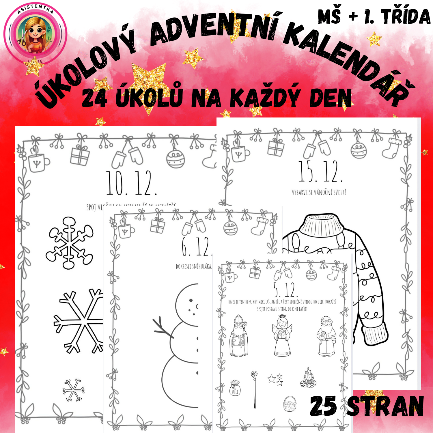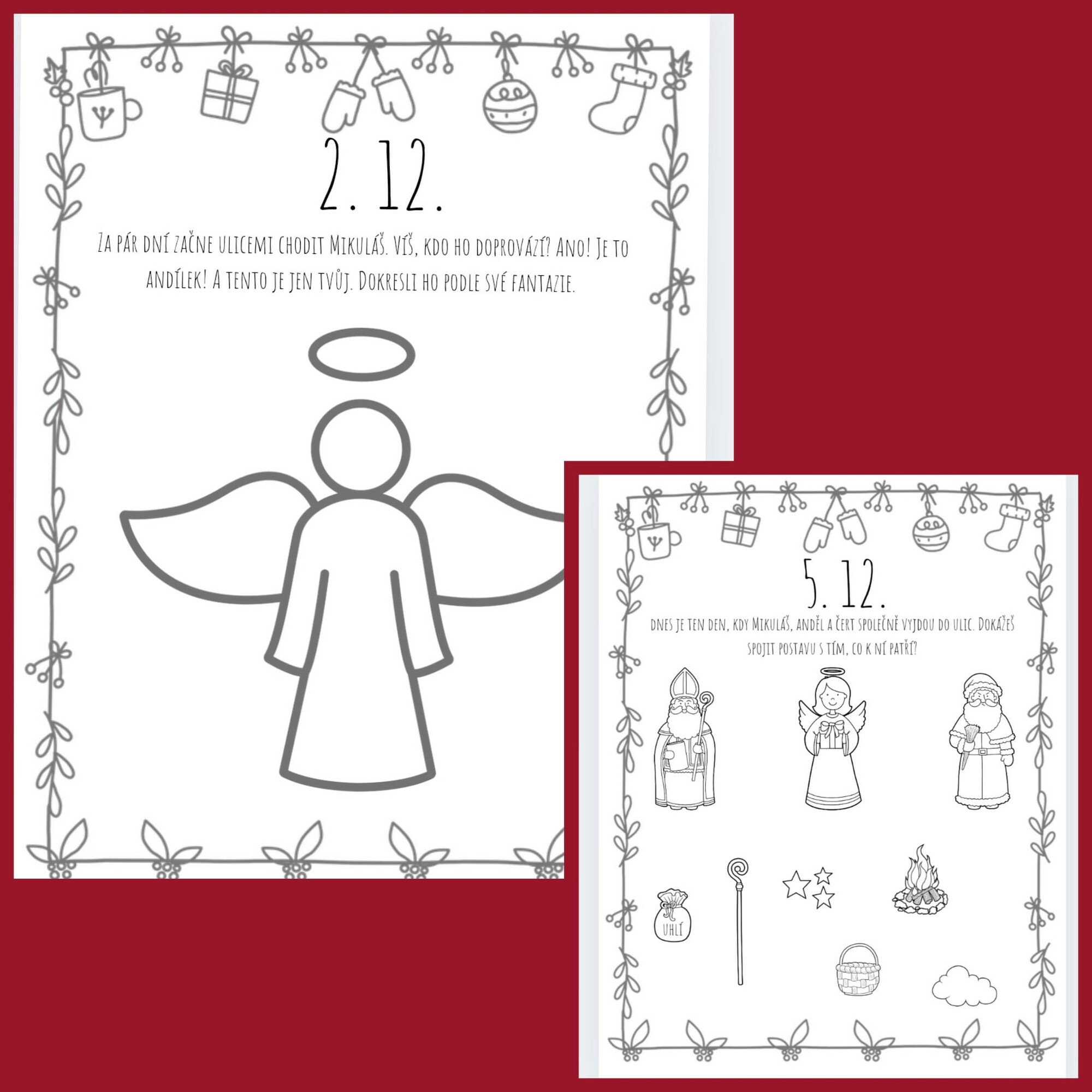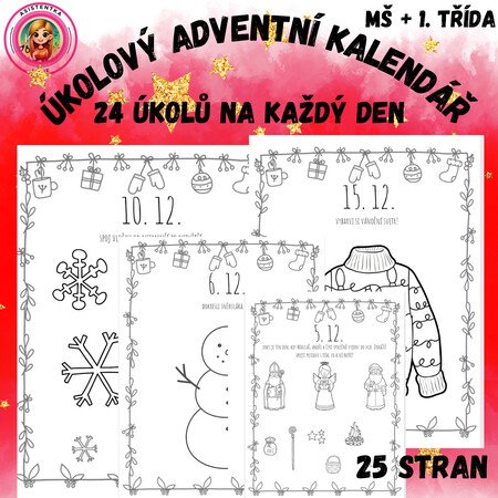 Tento adventní materiál obsahuje 24 jednoduchých, srozumitelných a věkově přiměřených úkolů určených pro děti předškolního věku (přibližně 3–6 let). Každý úkol je zpracován jako samostatná strana A4, kterou lze využít buď jednotlivě, nebo vložit do adventních kapsiček. Úkoly nejsou tematicky náročné a jsou navrženy tak, aby je děti byly schopné samostatně či s minimální dopomocí splnit.