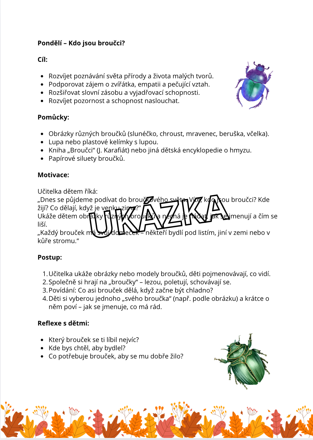Soubor je určen pro mateřské školy a obsahuje kompletní týdenní plán aktivit inspirovaný známým motivem broučků, kteří se na podzim ukládají k zimnímu spánku.