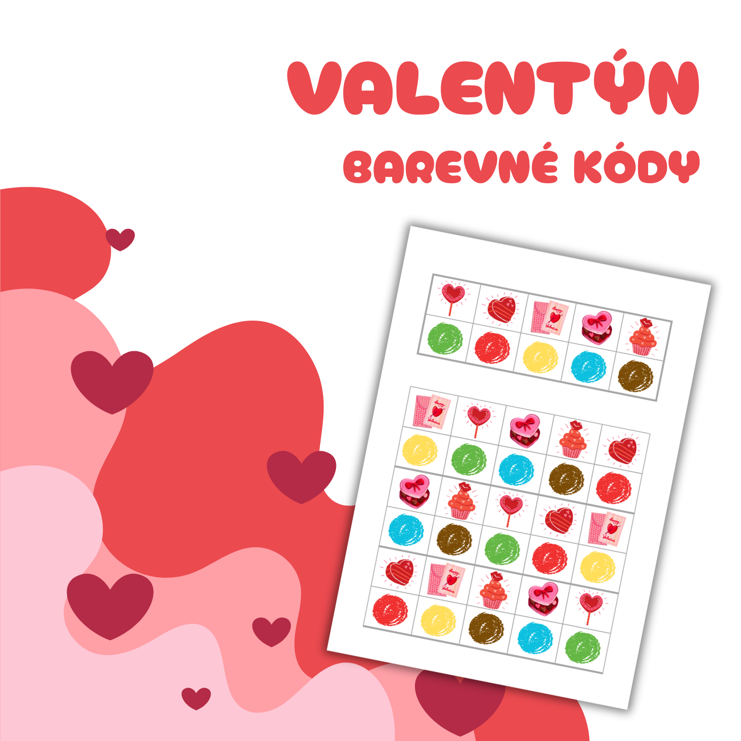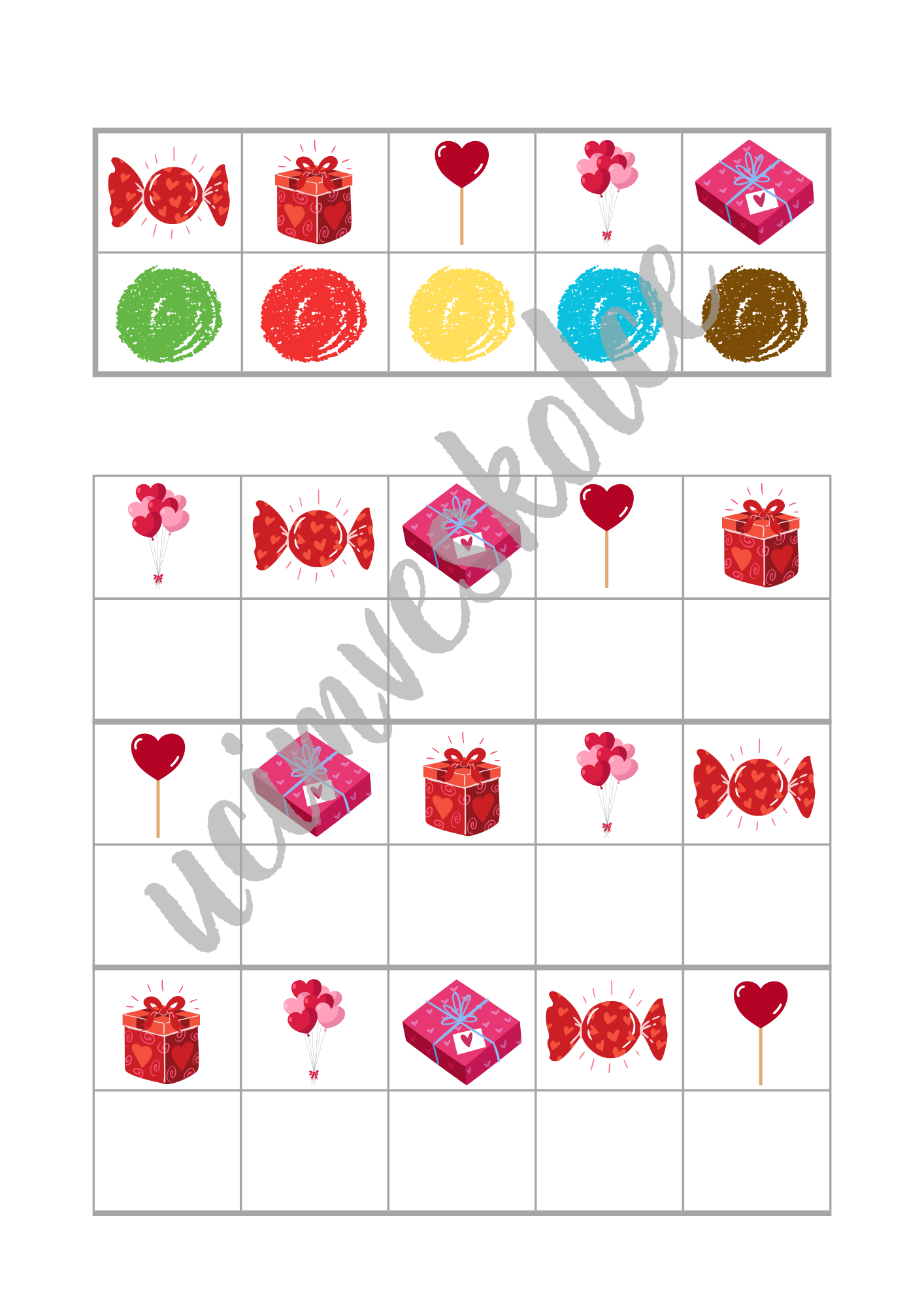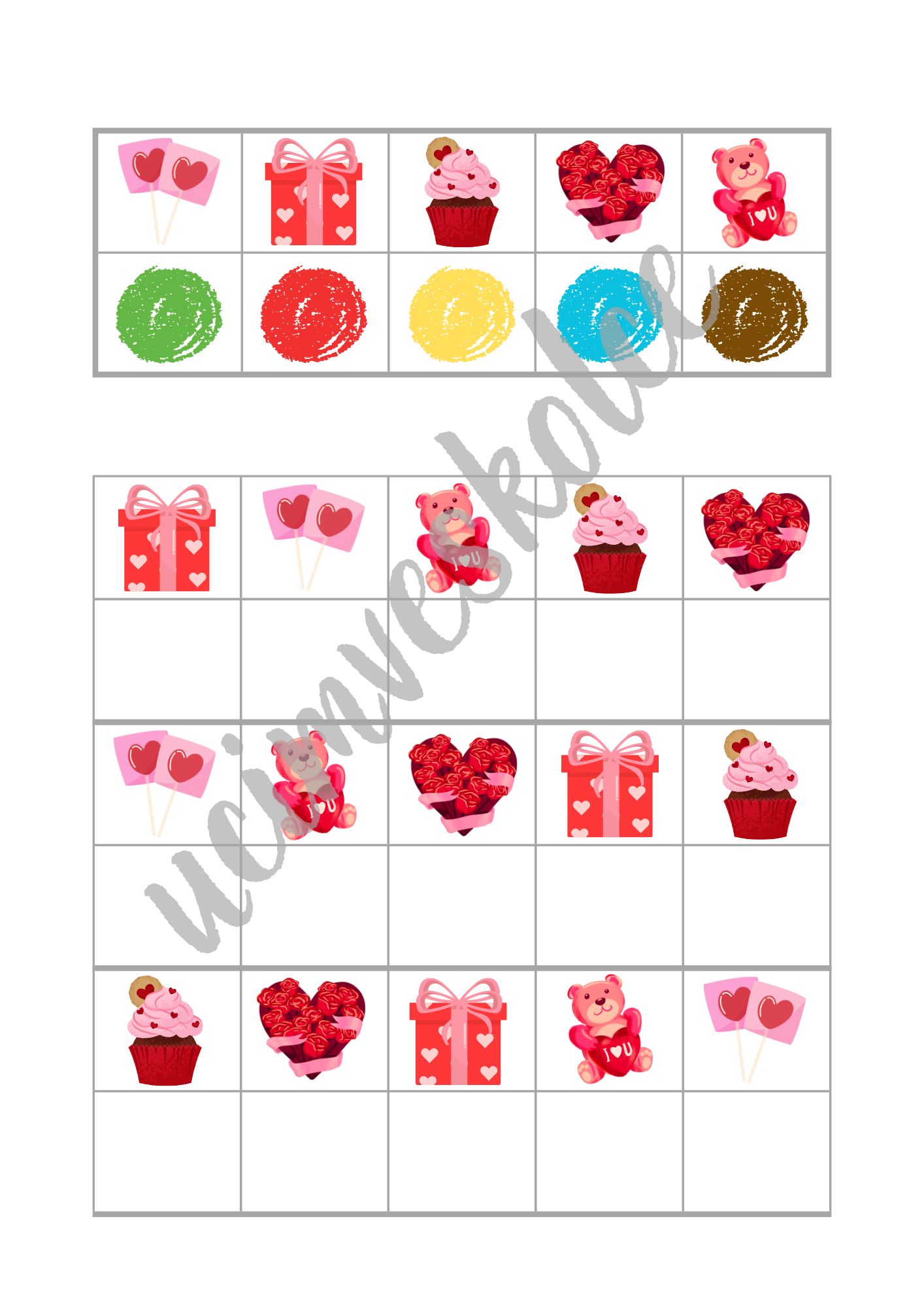 - Ve formátu velkých (zalaminovaných) karet: Po vytisknutí jednotlivé listy (str. 4-25) pro delší výdrž zalaminujte (celkem 22 velkých karet). Strany 26-27 také pro delší výdrž zalaminujte a poté z nich vystřihněte malé kartičky s obrázky barevných puntíků (celkem 80 kartiček). Na každé velké kartě jsou dvě tabulky. První tabulka je v horní části. V prvním řádku této tabulky je 5 políček s obrázky. V druhém řádku této tabulky je 5 políček s různě barevnými puntíky. Políčku s obrázkem v prvním řádku je přiřazeno políčko s barevným puntíkem pod ním. V druhé tabulce, která se nachází níže, je celkem 6 řádků. V každém lichém řádku (první, třetí, pátý) je 5 políček s obrázky. V každém sudém řádku (druhý, čtvrtý, šestý) je 5 prázdných políček. Úkolem dětí je do prázdných políček umístit kartičku s puntíkem správné barvy (kartičky ze str. 24-25). Podle vzoru v první tabulce v horní části karty může provést kontrolu pedagog či dítě samotné. Velké zalaminované karty lze využít též bez malých kartiček. Děti mohou do prázdných políček zakreslovat barevné puntíky smazatelnými fixy, přikládat do prázdných políček barevné knoflíky, kostky atd.