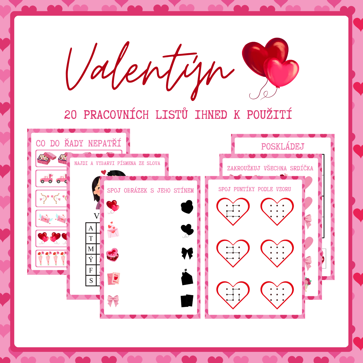Materiál je zaměřen na téma Valentýn. Toto téma je dětem přiblíženo pomocí pracovních listů, které stačí pouze vytisknout a použít.