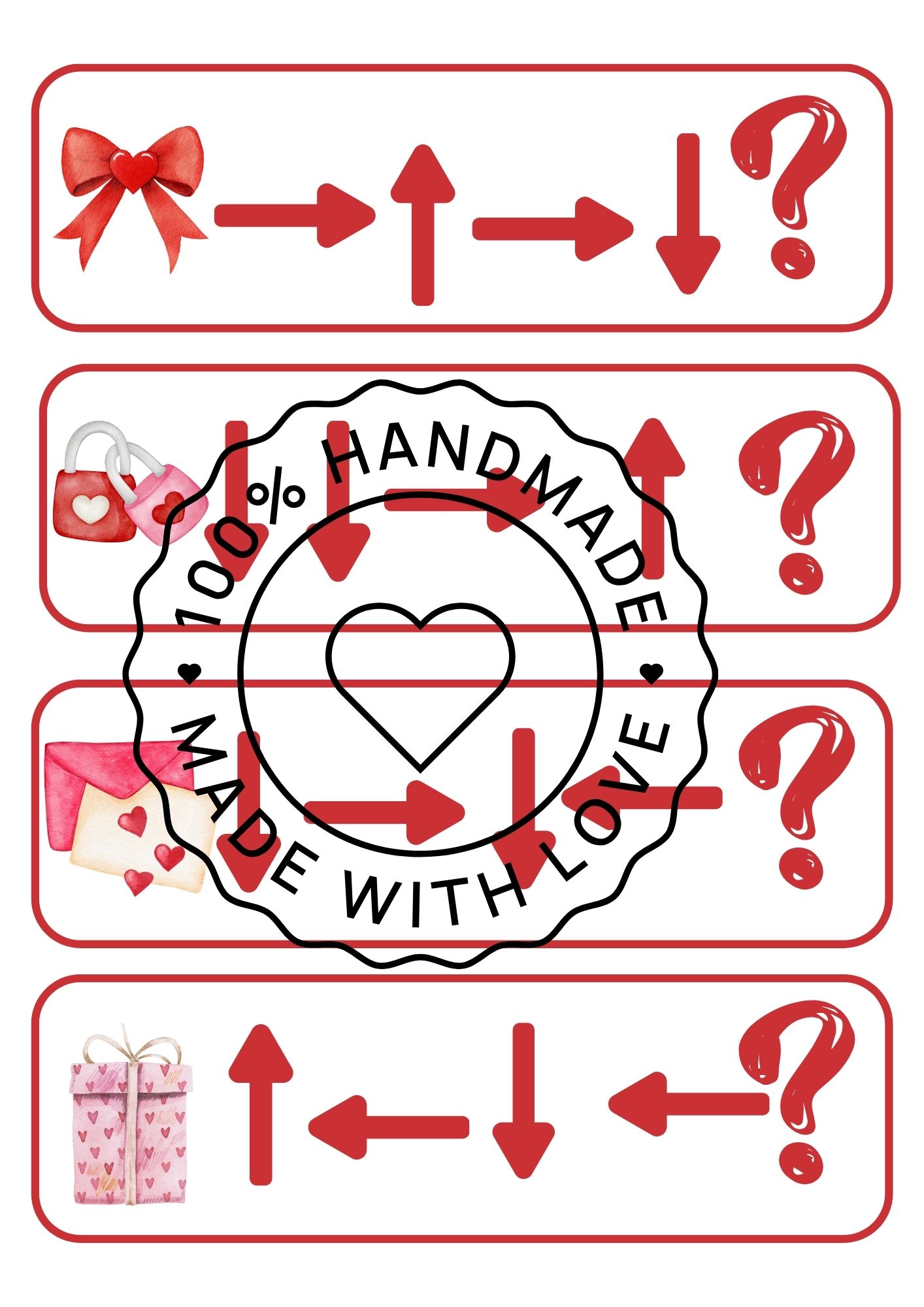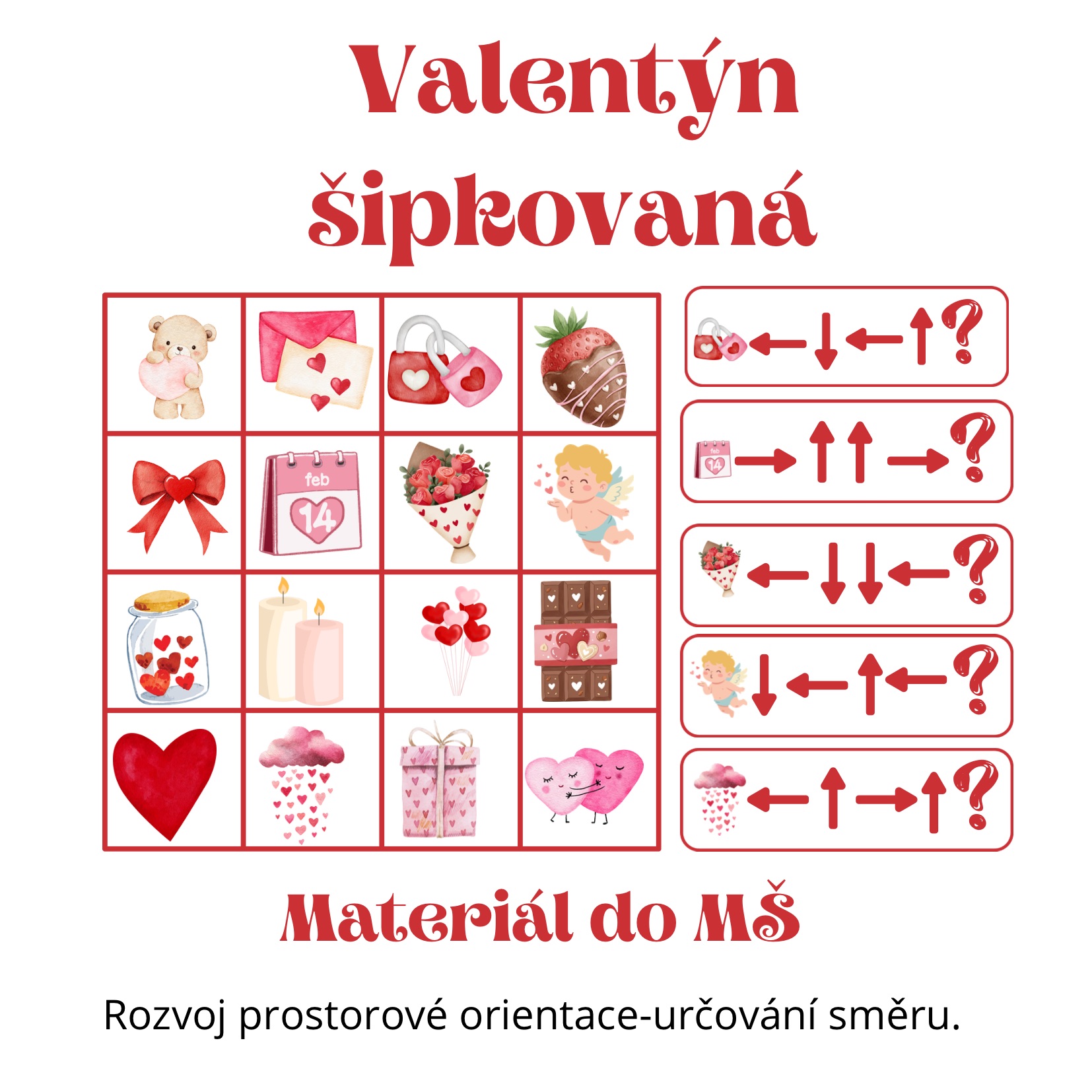 Veselá hra pro děti, která učí sledovat směr a přemýšlet. Podle šipek děti zjistí, jaký valentýnský symbol je na konci cesty, a doplní správný obrázek. Rozvíjí logiku, orientaci i pozornost. Stačí vytisknout, vystříhat a hrát si! 💕