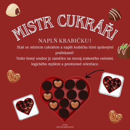 Staň se mistrem cukrářem a naplň krabičku těmi správnými pralinkami! Tento hravý soubor je zaměřen na rozvoj zrakového vnímání, logického myšlení a prostorové orientace.