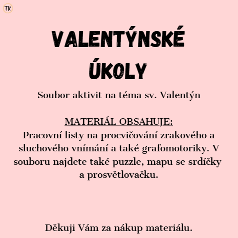 Pracovní listy na procvičování zrakového a sluchového vnímání a také grafomotoriky. V souboru najdete také puzzle, mapu se srdíčky