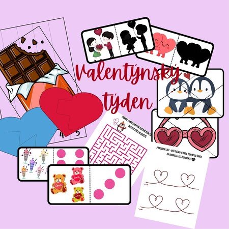 Valentýnský vzdělávací balíček pro MŠ plný hravých aktivit ke stolečku, které rozvíjejí zrakové vnímání, logické myšlení, jemnou motoriku, počítání i grafomotoriku.