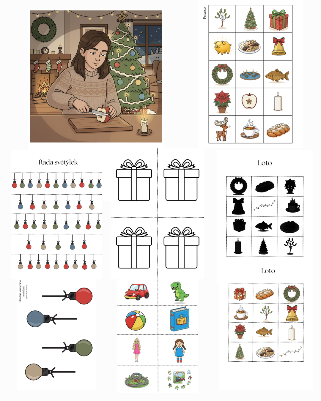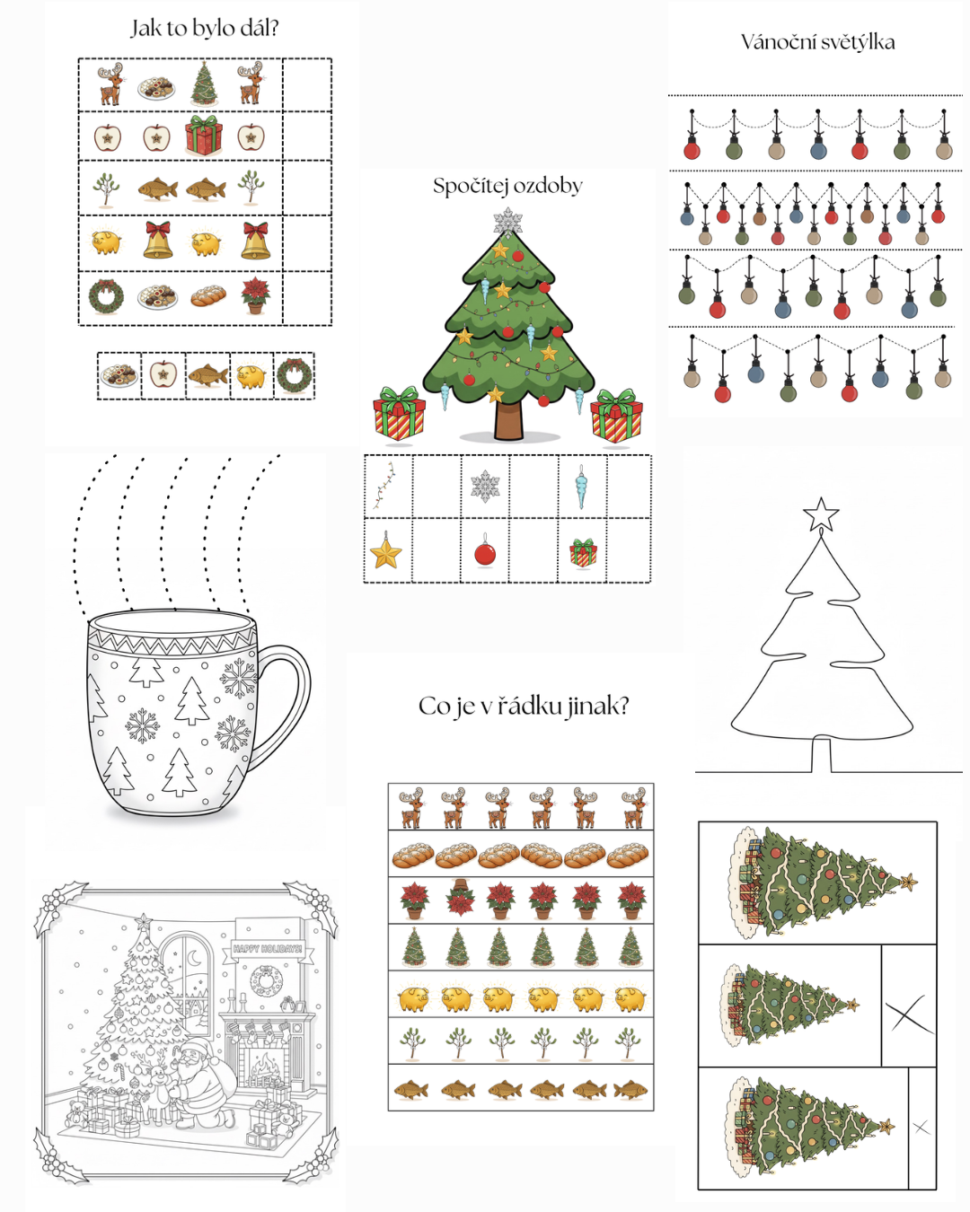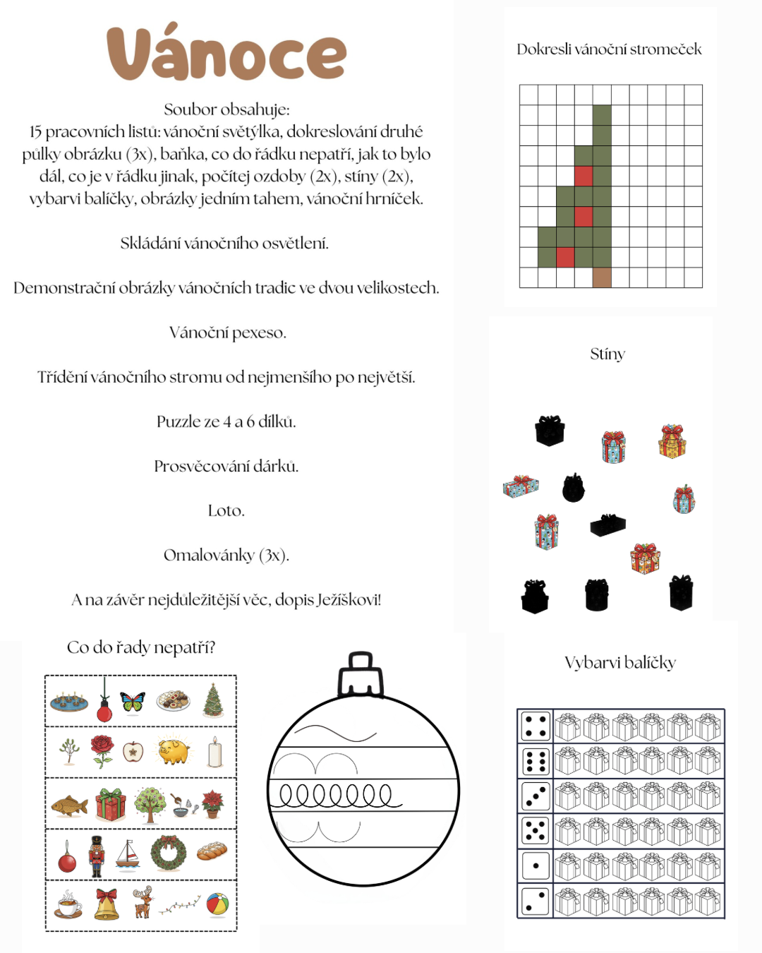 15 pracovních listů: vánoční světýlka, dokreslování druhé půlky obrázku (3x), baňka, co do řádku nepatří, jak to bylo dál, co je v řádku jinak, počítej ozdoby (2x), stíny (2x), vybarvi balíčky, obrázky jedním tahem, vánoční hrníček.