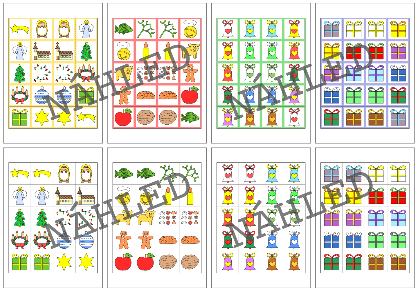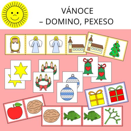 Materiál obsahuje čtyři strany s kartičkami domina (1 strana = 1 sada kartiček domina = 10 kartiček) a čtyři strany s kartičkami pexesa (40 dvojic). Tématem jsou Vánoce.