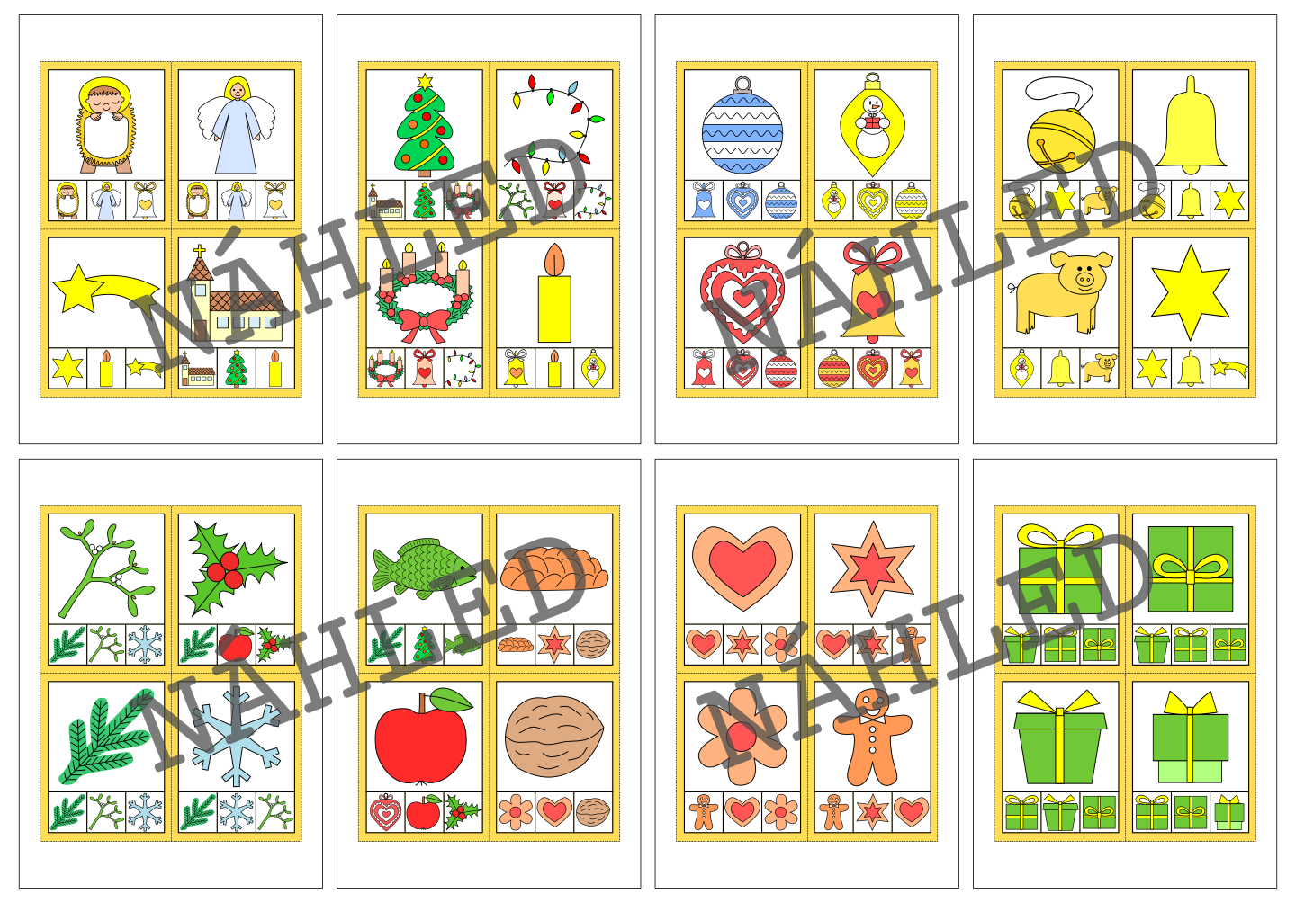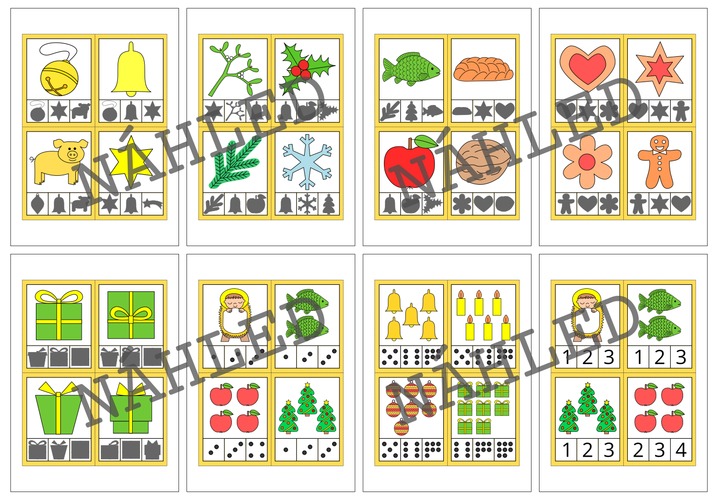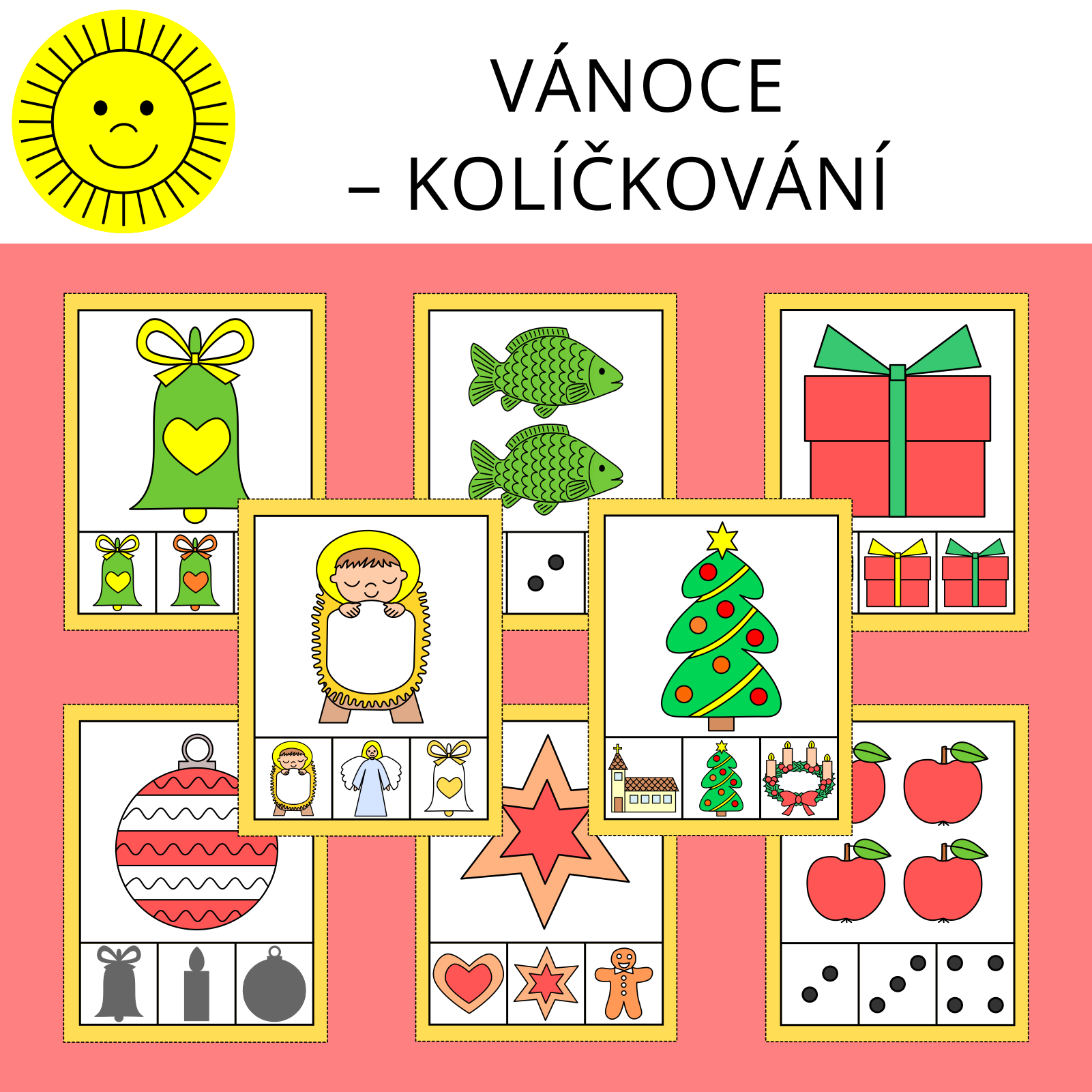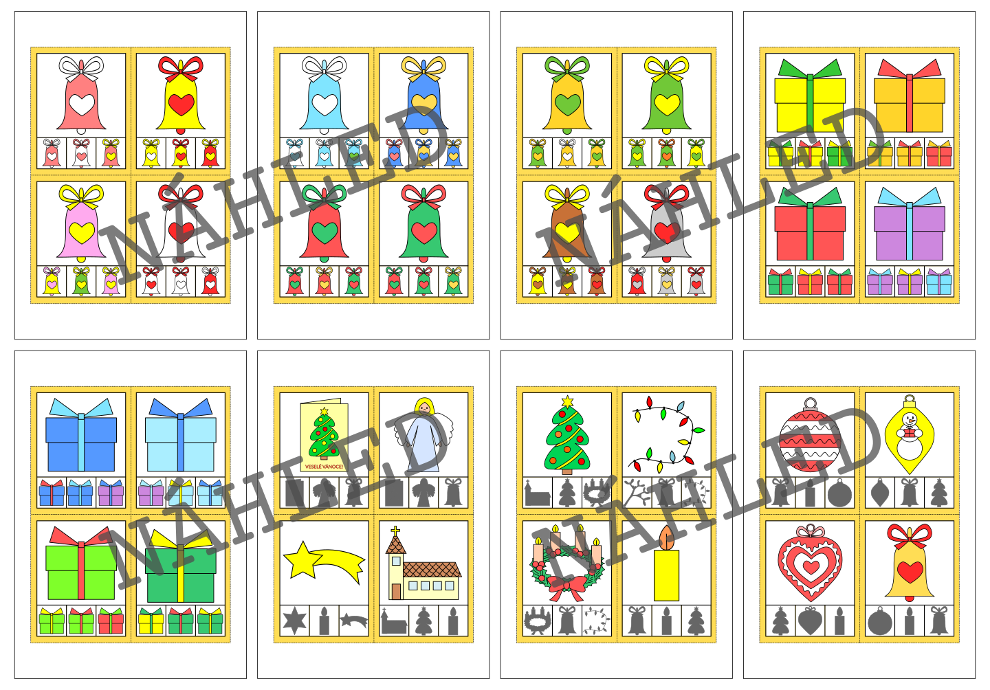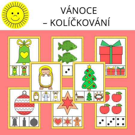 Materiál na téma Vánoce slouží k procvičení zrakového vnímání a počítání. Obsahuje 100 kartiček.