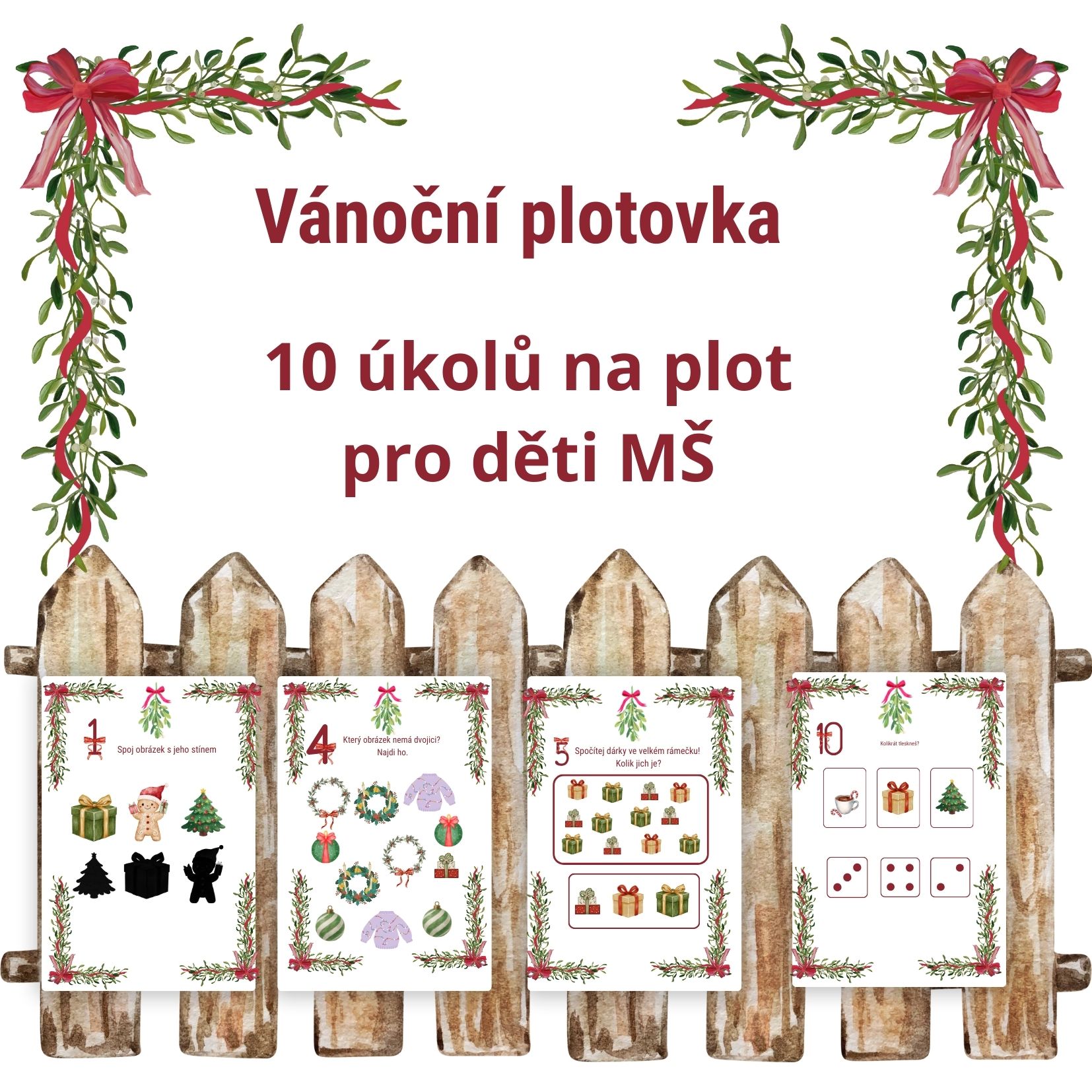 Vánoční plotovka je jednoduchá venkovní stezka pro děti a rodiče. Na plotě nebo podél cesty bude pro ně připraveno 10 krátkých úkolů s vánoční tematikou – hádanky, pohybové úkoly i jednoduché úkoly na pozornost