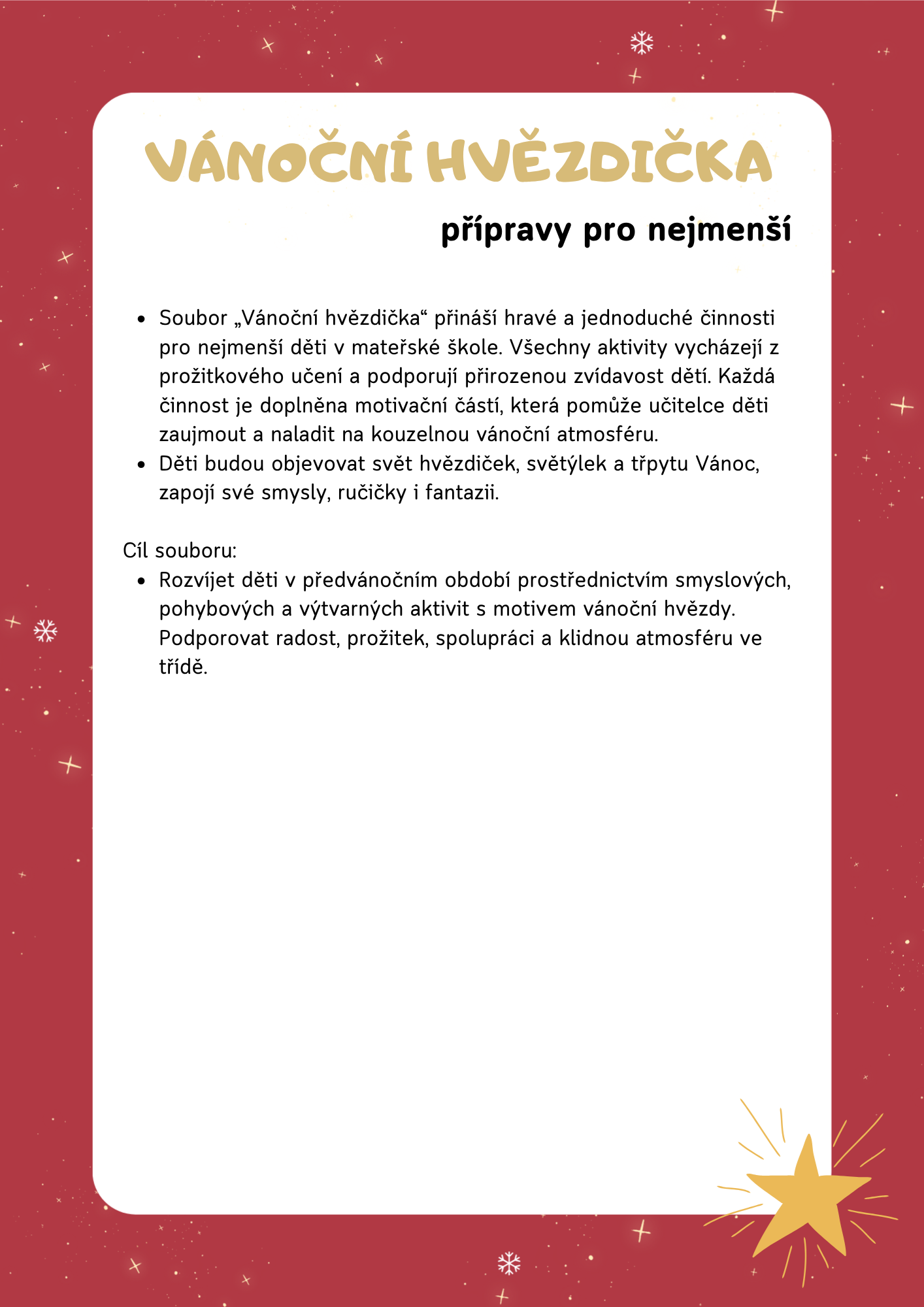 Soubor je ideální pro klidné a radostné adventní období, kdy se děti učí prožívat Vánoce všemi smysly.
