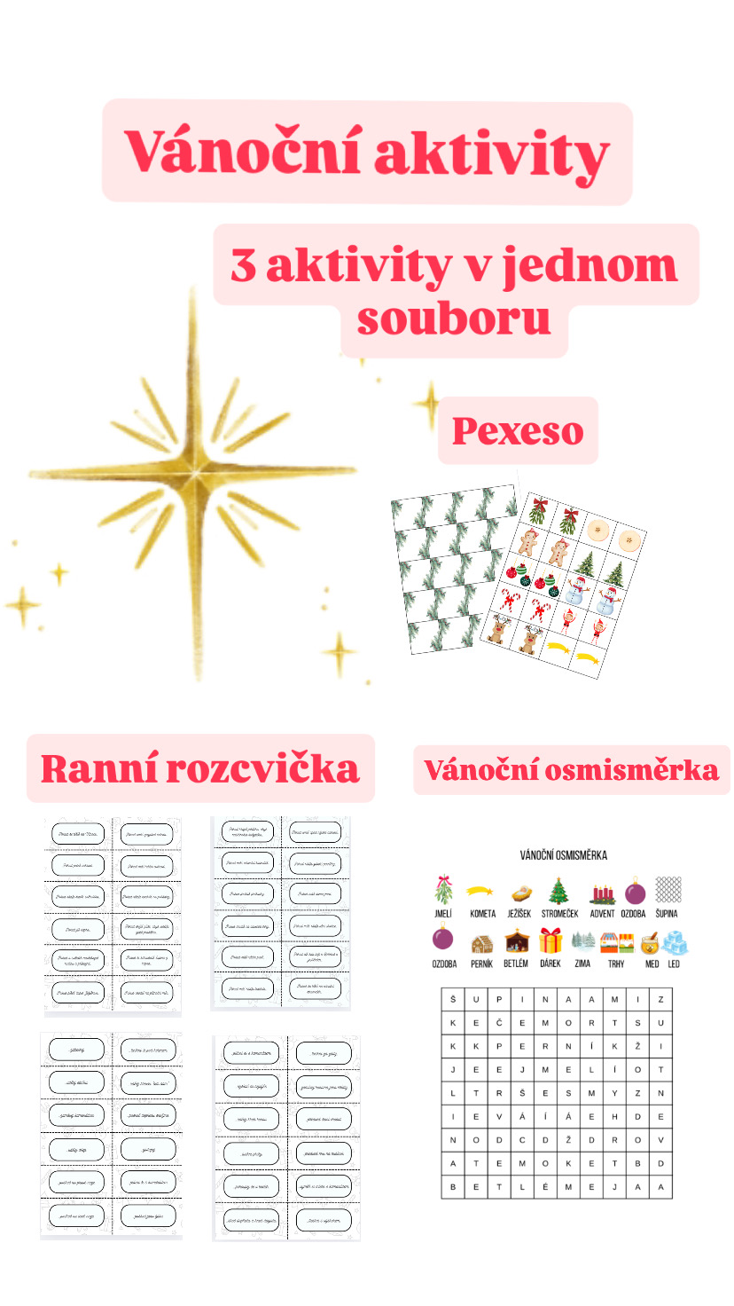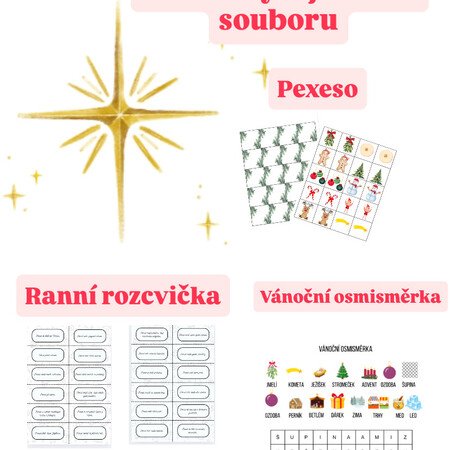 Připravila jsem soubor, který obsahuje tři originální aktivity s vánoční tematikou. První z nich je pexeso zaměřené na vánoční svátky, které dětem přinese zábavu i možnost procvičit paměť. Druhou aktivitou je „adventní rozcvička“. Ta zahrnuje 24 kartiček s podmínkami a 24 kartiček s aktivitami, které plní vždy ti, na něž se daná podmínka vztahuje. Aktivitu lze využít v různých obměnách – například jako krátké rozhýbání dětí po výuce v lavicích, a zároveň krásně podpoří adventní atmosféru. Třetí aktivitou je osmisměrka s tajenkou, kterou můžete zařadit jako doplňkovou činnost ve třídě nebo třeba ve školní družině.