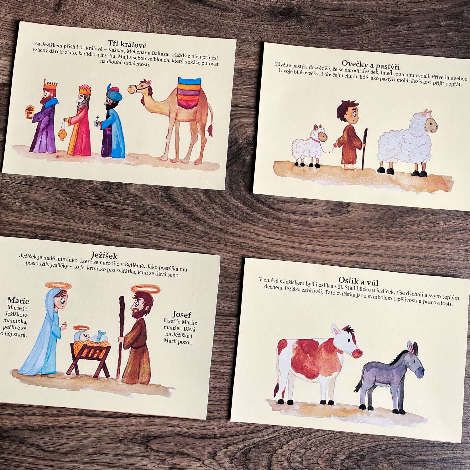 - 4× infokartičky s betlémskými postavami psané jednoduchým, dětem srozumitelným jazykem (barevné)