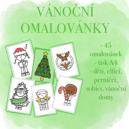 Soubor obsahuje 45 omalovánek s vánočním motivem. Najdete zde děti, elfíky, perníčky, soby a vánoční domy. Hodí pro děti od 3 let. Podporují jemnou motoriku, koncentraci a kreativitu. Lze je vytisknout na papír velikosti A4 nebo lze vytisknout více omalovánek na jednu stránku a vytvořit z nich menší omalovánky pro děti (nastavení při tisku, např. 4 obrázky na stránku - menší omalovánky, menší plocha na vybarvení).