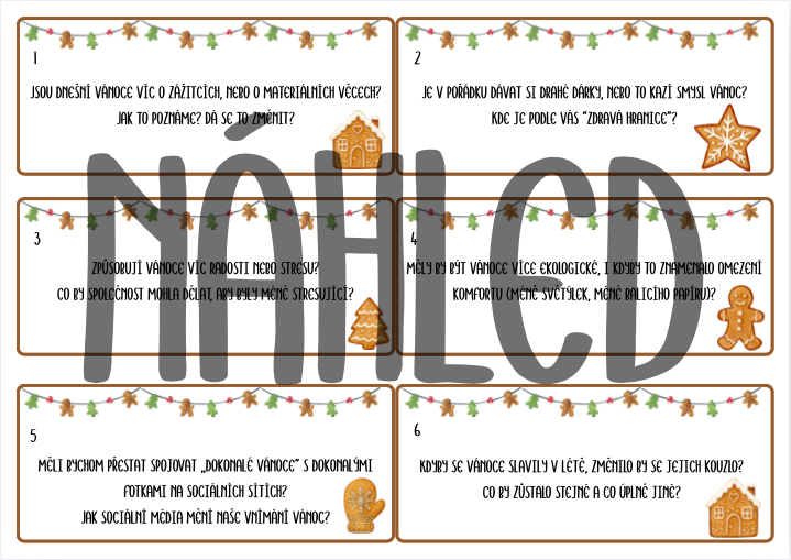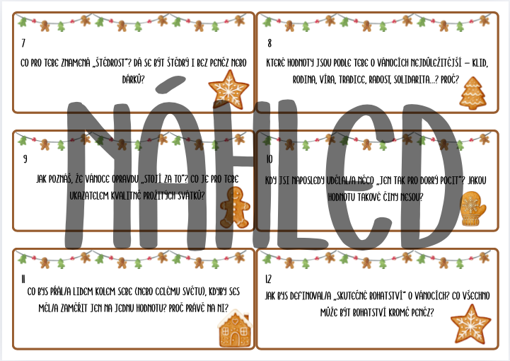 Materiál slouží k předvánočnímu zamyšlení a klidně ke společným diskuzím. Otázky by měly v žácích vyvolat zamyšlení nad vánočními hodnotami.