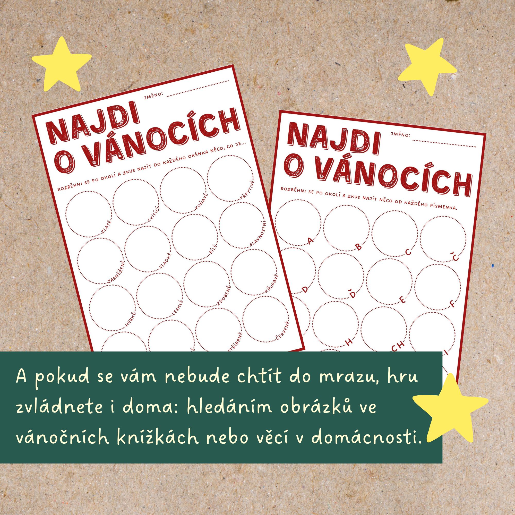 ⭐Aktivitu můžete pojmout jako vánoční bingo nebo si domyslet vlastní pravidla. Nám doma hra slouží jako záminka k procházce i v chladném počasí, kdy má člověk spíš chuť zalézt pod peřinu. Moje děti hru milují ve všech jejích podobách, tak doufám, že udělá radost i těm vašim. Pěkný společný předvánoční čas!
