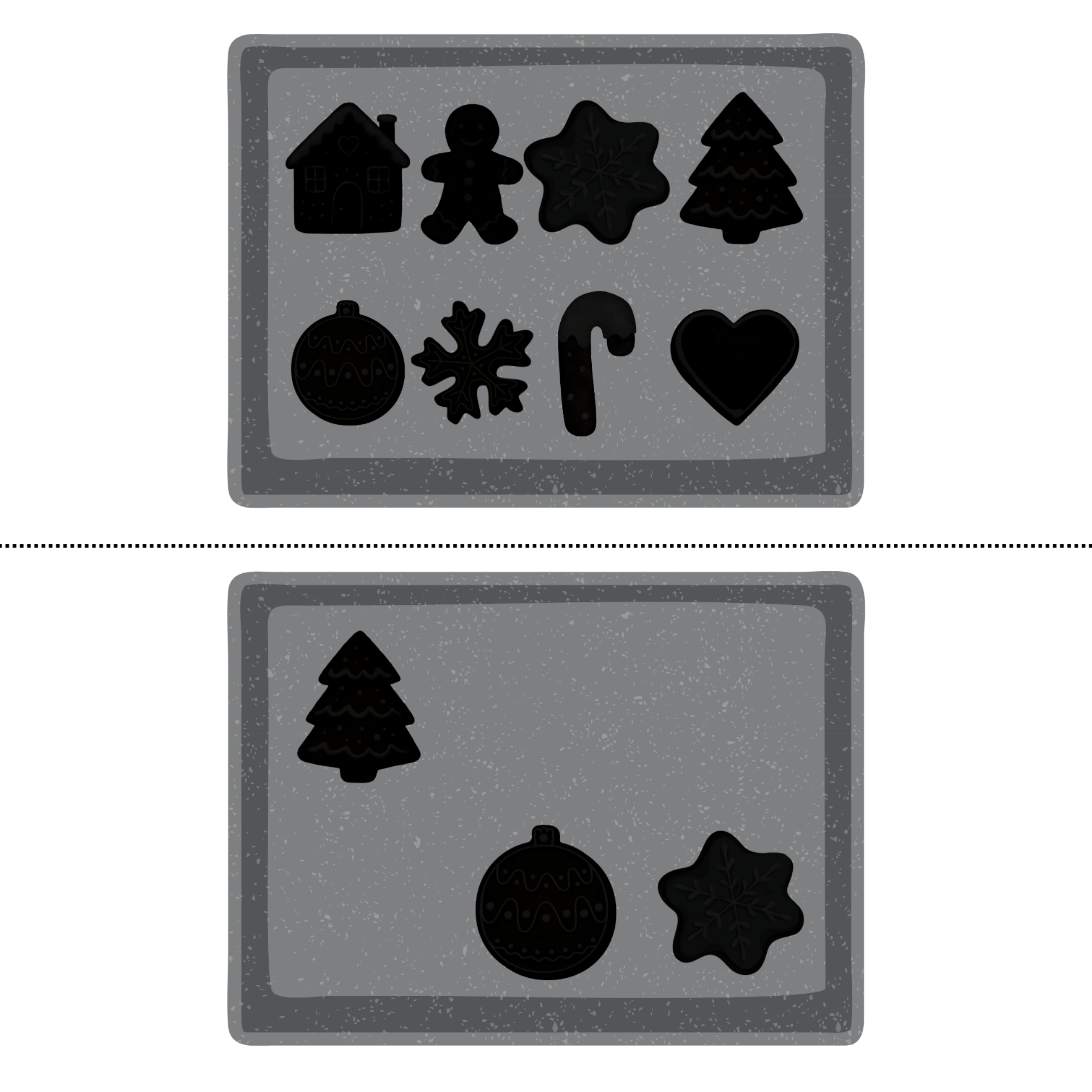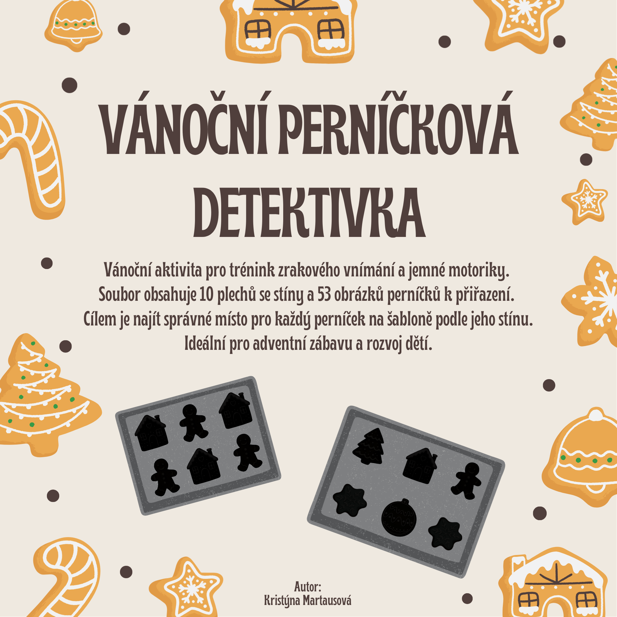Soubor obsahuje 10 šablon pečicích plechů se stíny a 53 barevných perníčků k vystřižení, které děti následně přikládají na správné místo. Cílem je najít správné spárování perníčku s jeho stínem na šabloně. Ideální pro adventní zábavu a rozvoj dětí.
