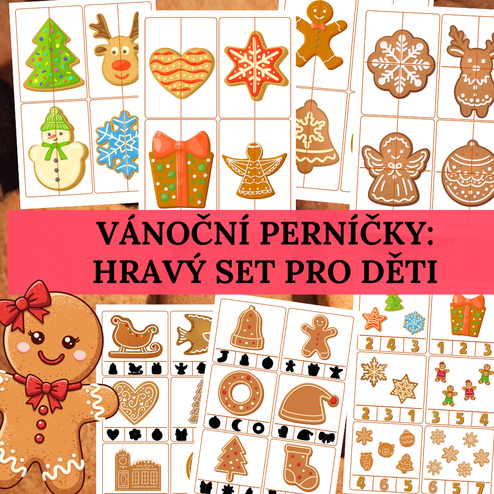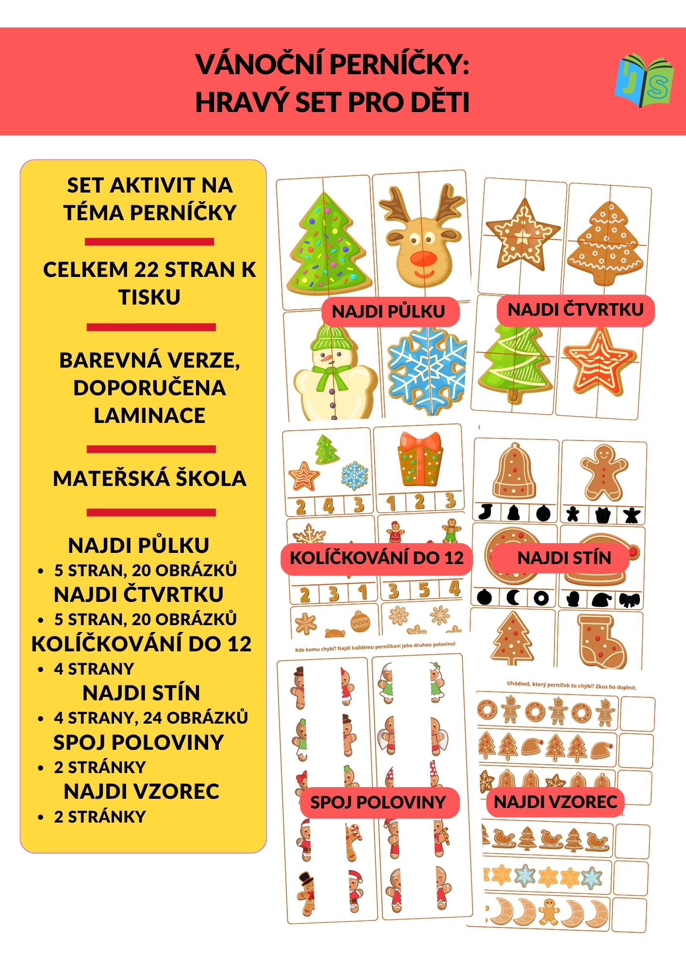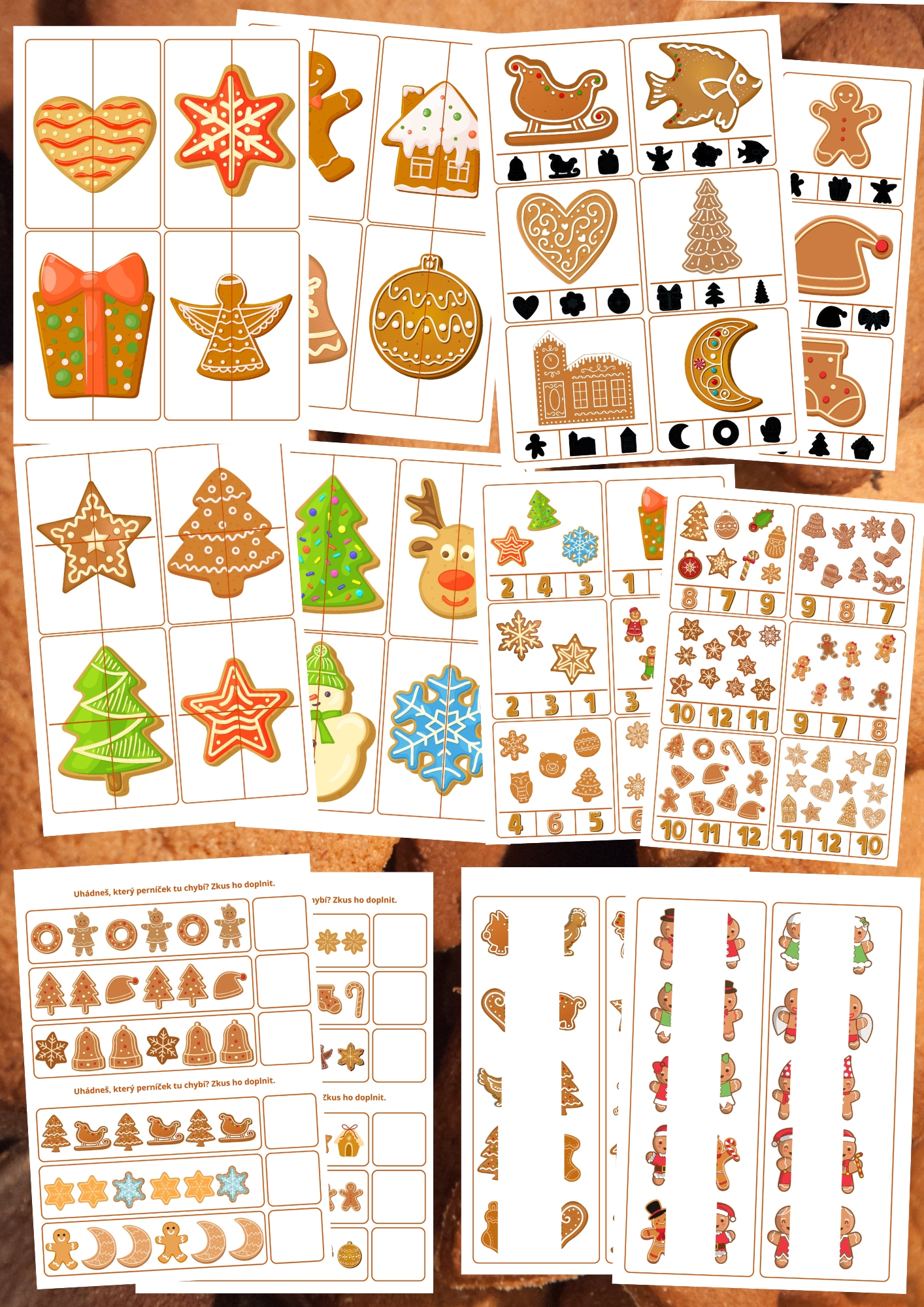 Tato sada Vánoční perníčky: Hravý set pro děti nabízí 22 stran zábavných a rozvojových aktivit, které jsou ideální do mateřské školy, 1.třídy i domácího vzdělávání. Najdete zde úkoly na hledání půlek a čtvrtek obrázků, párování stínů, doplňování vzorců i kolíčkování do 12.