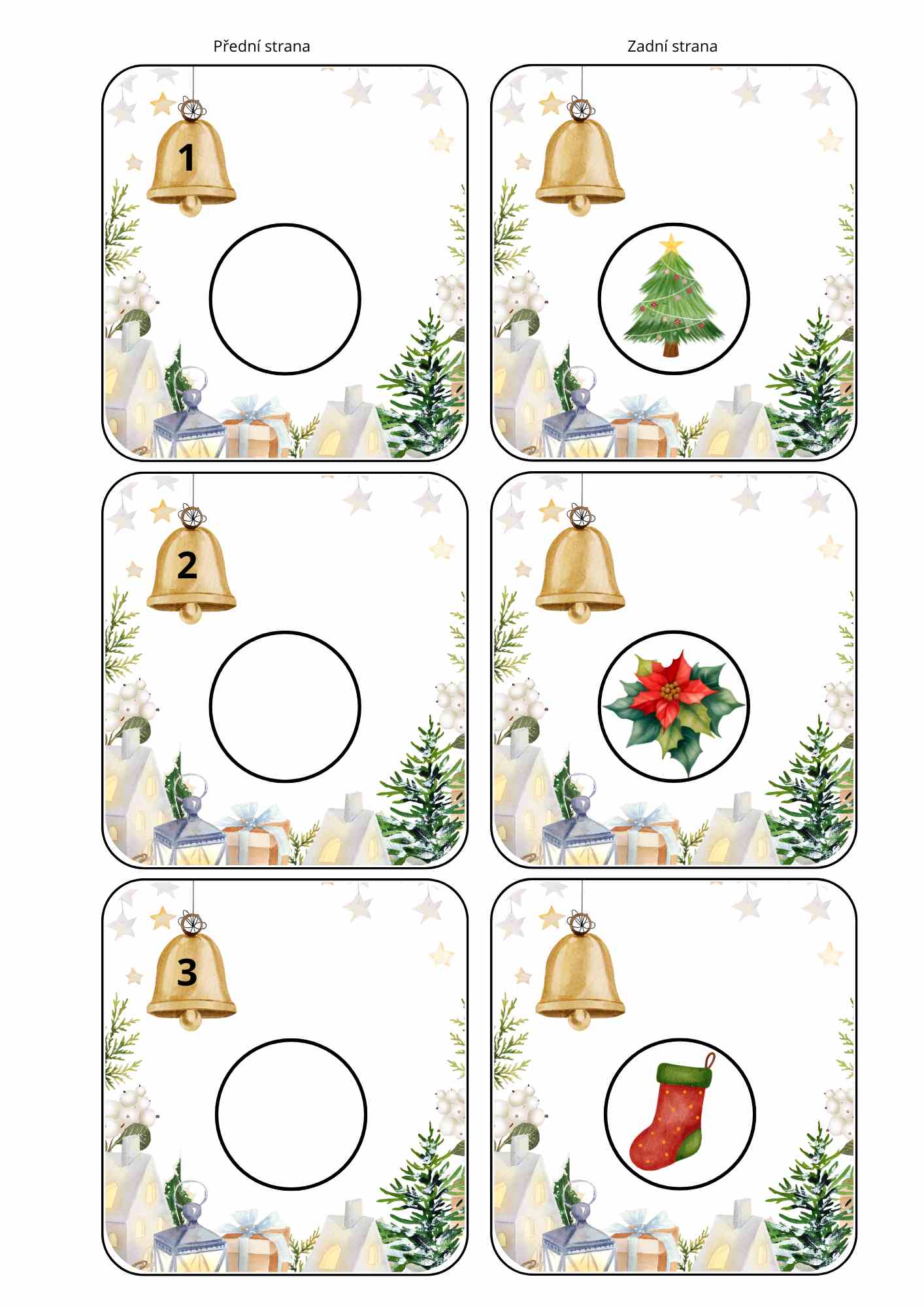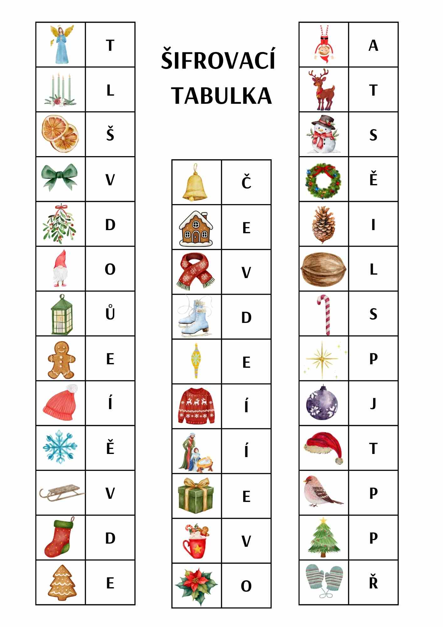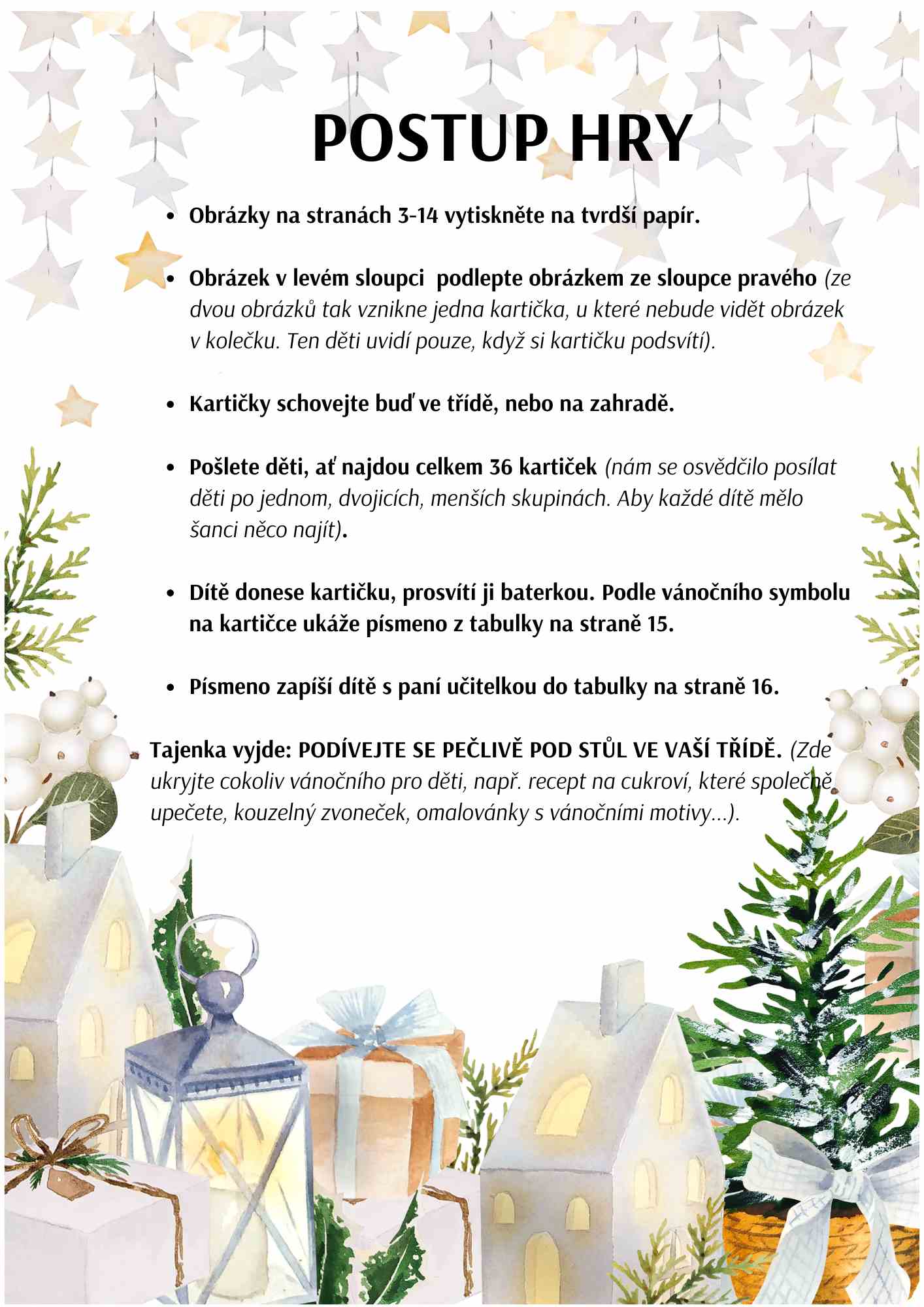 - Dítě donese kartičku, prosvítí ji baterkou. Podle vánočního symbolu na kartičce ukáže písmeno z tabulky na straně 15.