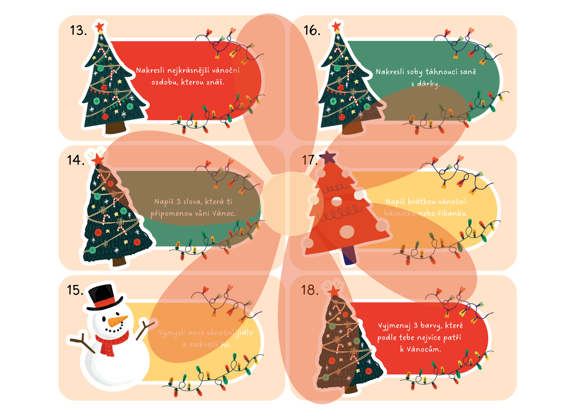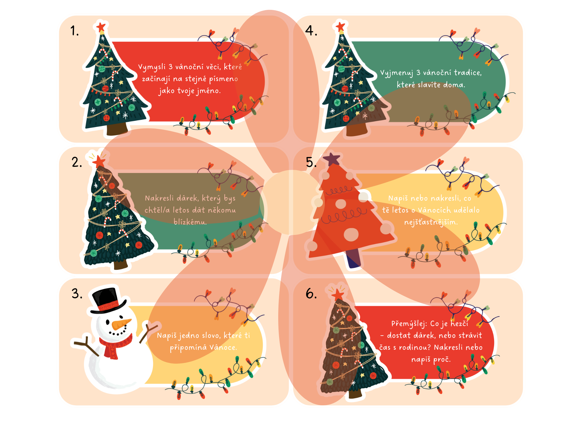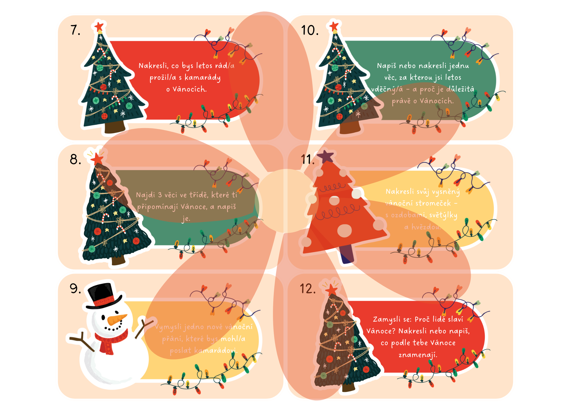 Tento materiál je určen pro žáky 1. stupně základní školy a představuje sadu krátkých vánočních zamyšlovacích úkolů, které lze využít například během třídnických hodin, klidových chvil nebo jako doplněk k vánoční výzdobě třídy.
