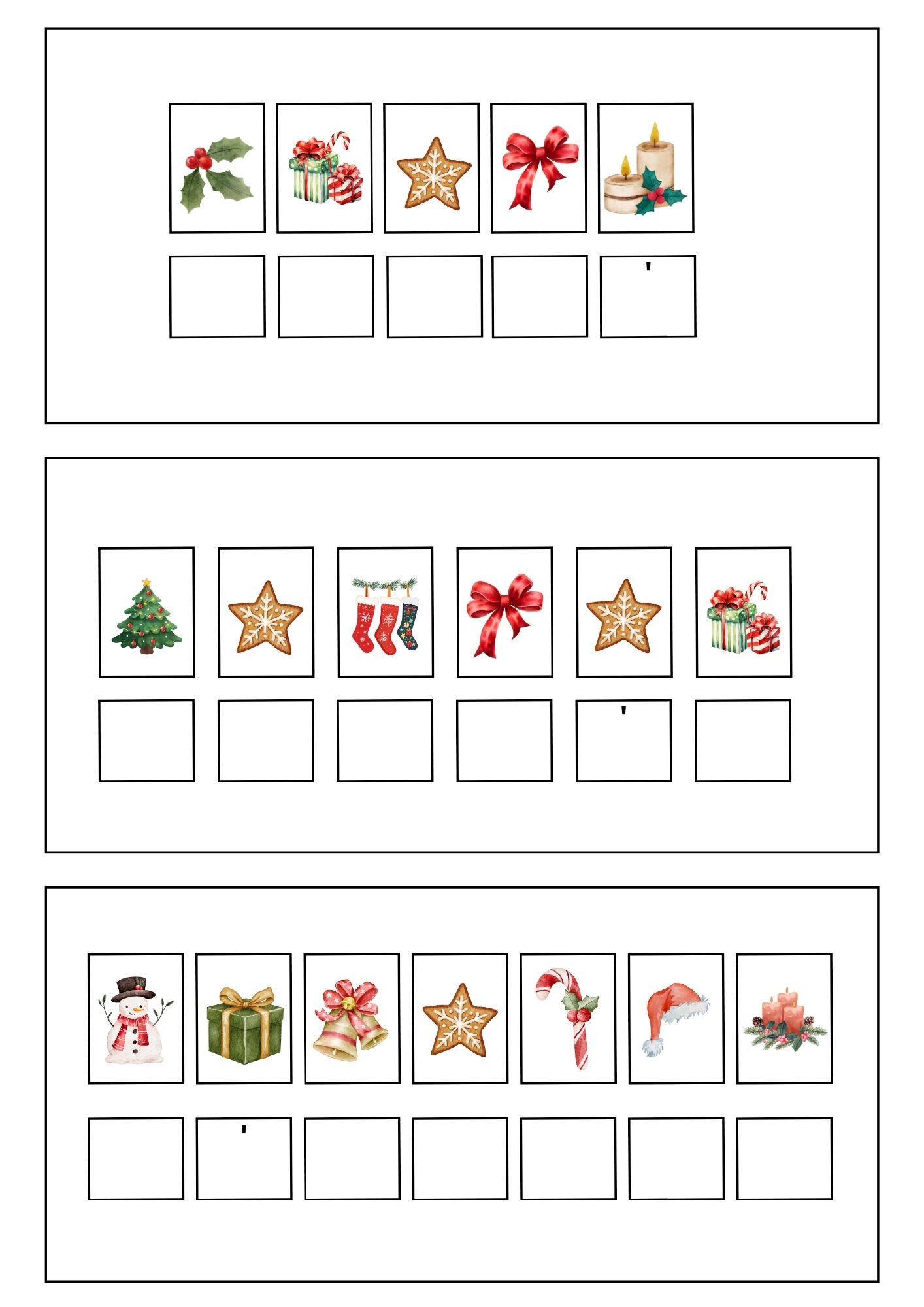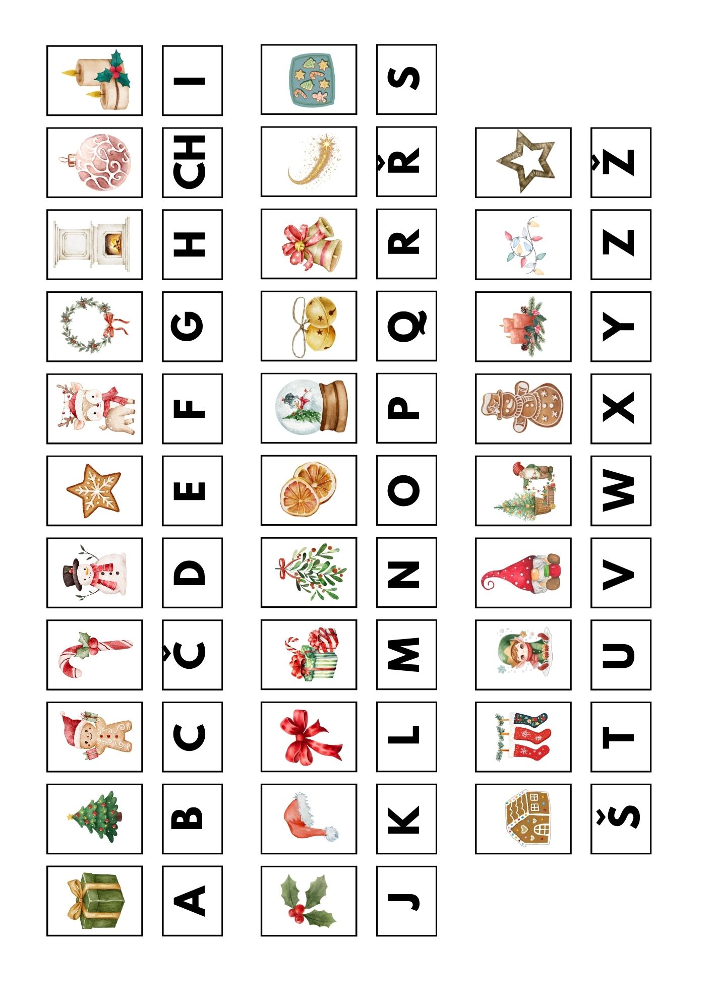 - 15 šifrovacích karet s vánoční tematikou – symboly, kódy, obrázky, spojování i luštění