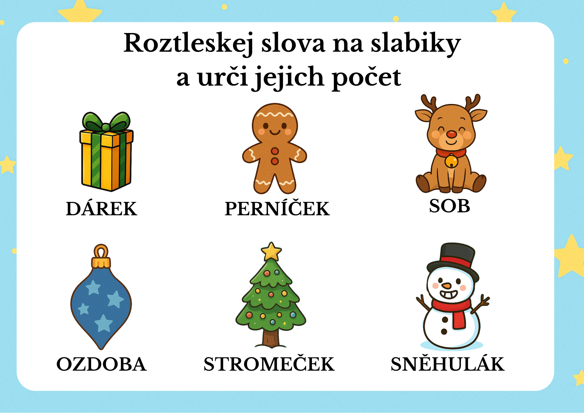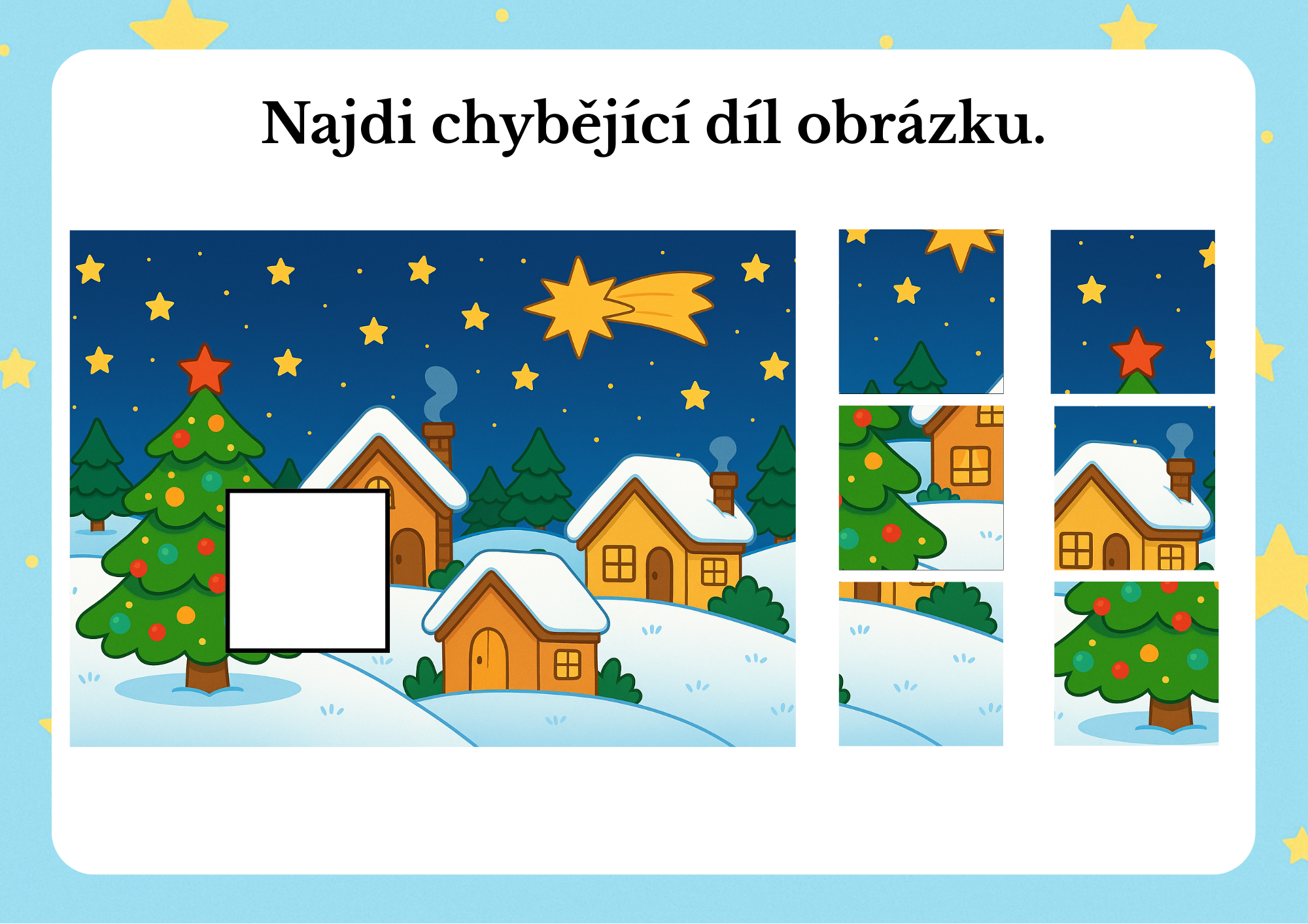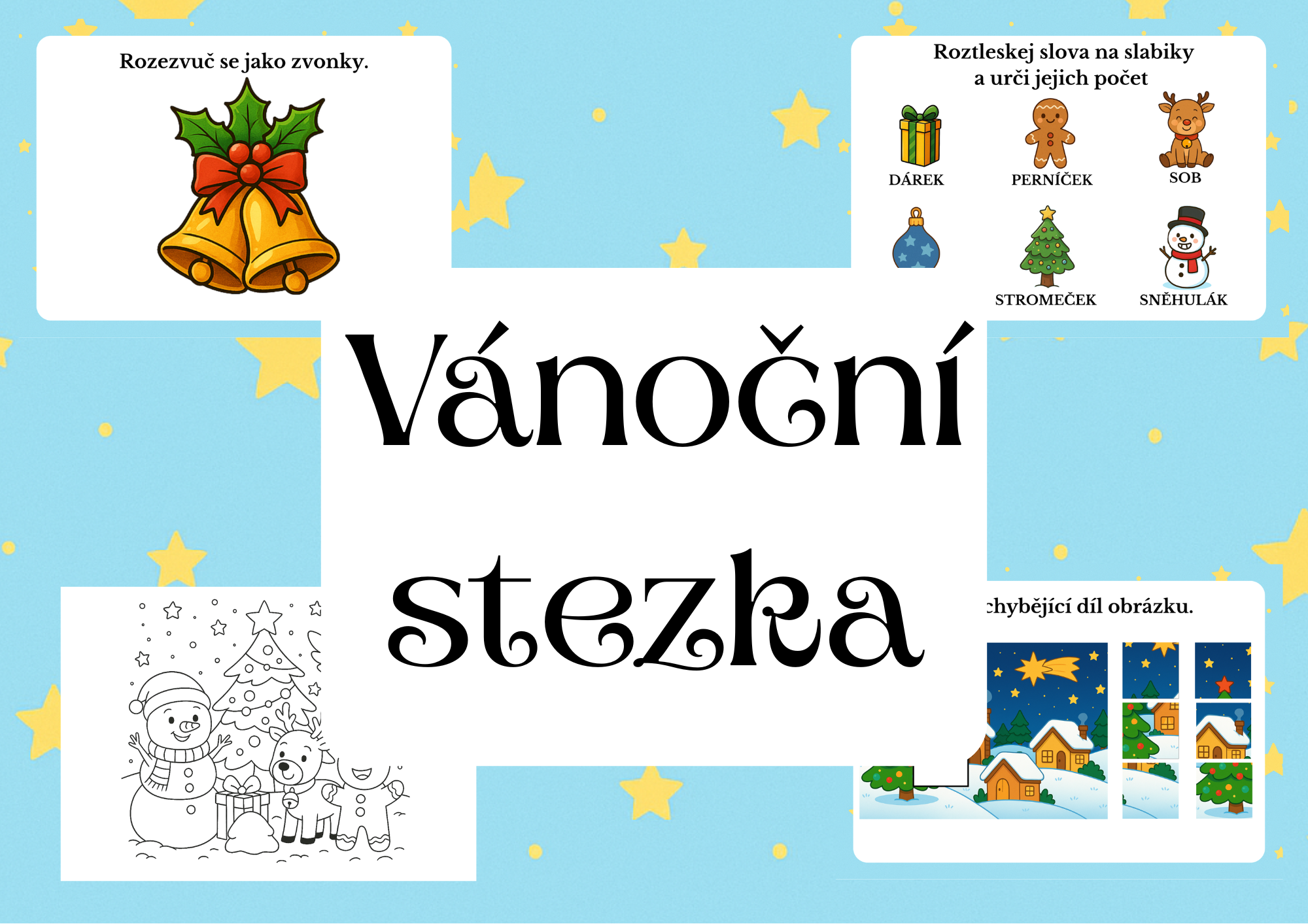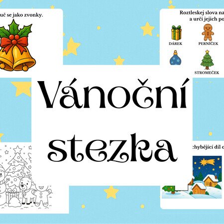 Vánoční stezka vhodná pro děti v mateřské škole. Stezka obsahuje 15 různých úkolů a lze ji využít ve třídě i venku. Úkoly jsou zaměřené na hledání rozdílů, obličejovou motoriku, emoce, počítání a další činnosti přiměřené věku. Délka stezky je flexibilní a lze ji přizpůsobit věku a možnostem dětí. Soubor obsahuje jako bonus i tematické omalovánky.