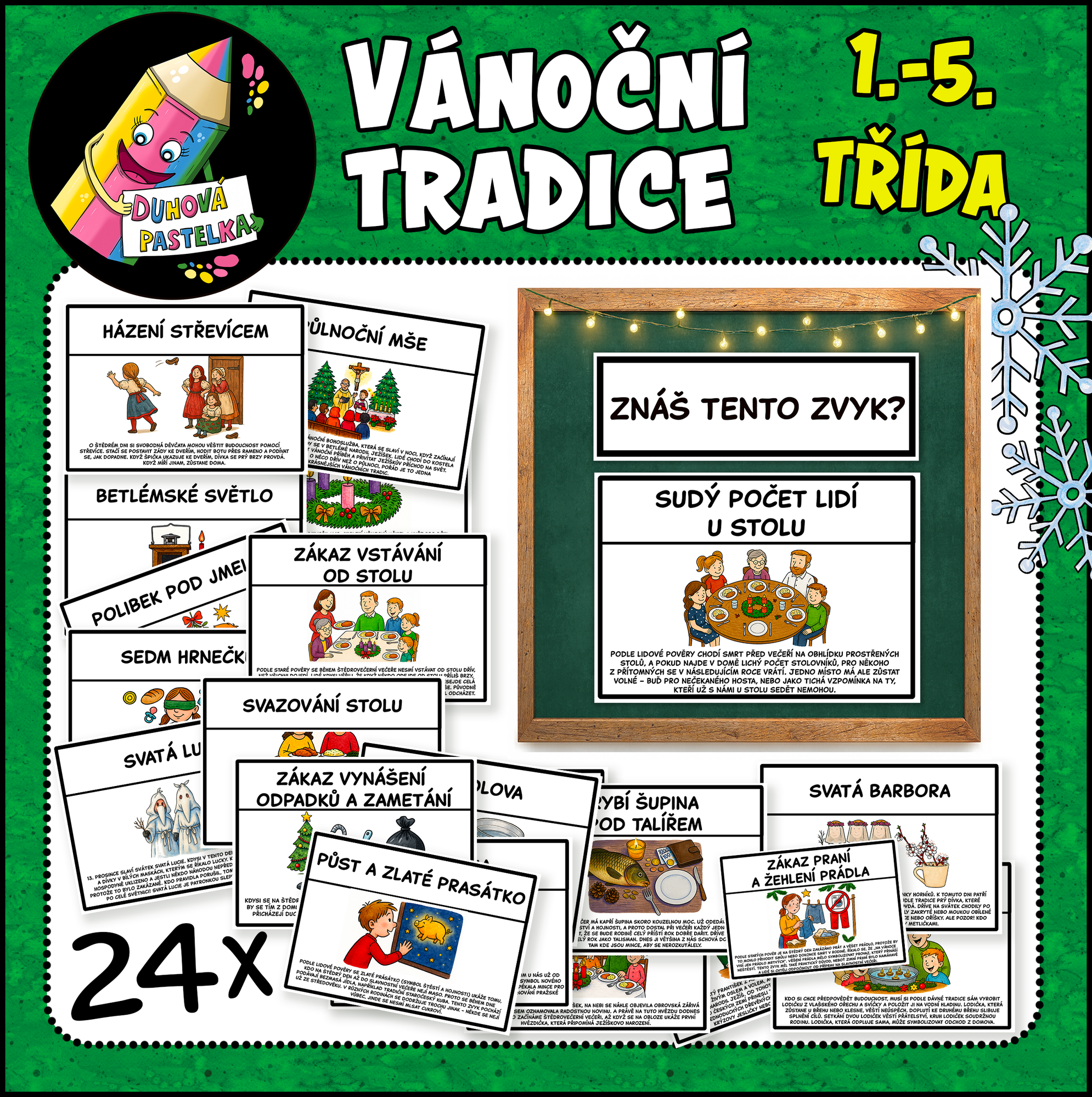 🟢 Nástěnka pro celou chodbu - Oživte vánoční výzdobu chodby a každý den připněte do řady další vánoční tradici. Žáci se tak už před příchodem do třídy seznámí s další tradici.