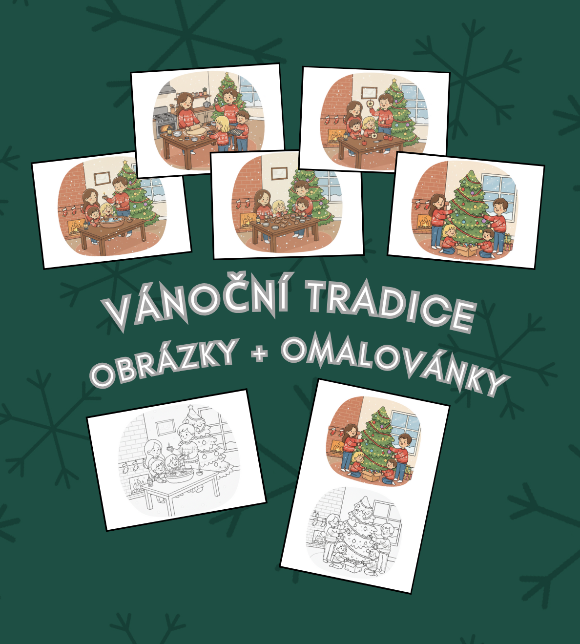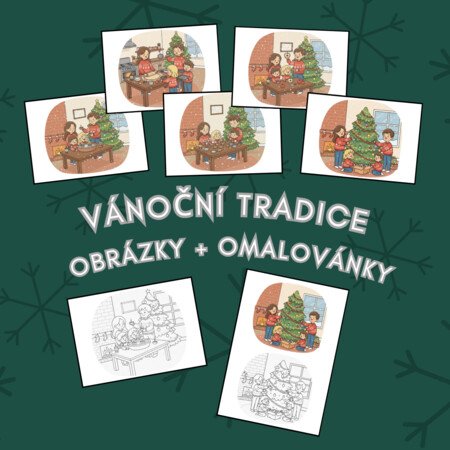 - 5 demonstračních obrázků nejznámějších vánočních tradic (pouštění lodiček, zdobení stromečku, pečení cukroví, zdobení perníčků, rozkrajování jablka)