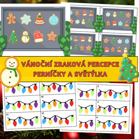 Tento vánoční soubor nabízí hravé aktivity zaměřené na rozvoj zrakové percepce, pozornosti k detailu, vizuální paměti a prostorové orientace. Děti skládají barevné světýlkové řady a vánoční perníčky na plech podle vzorových karet.