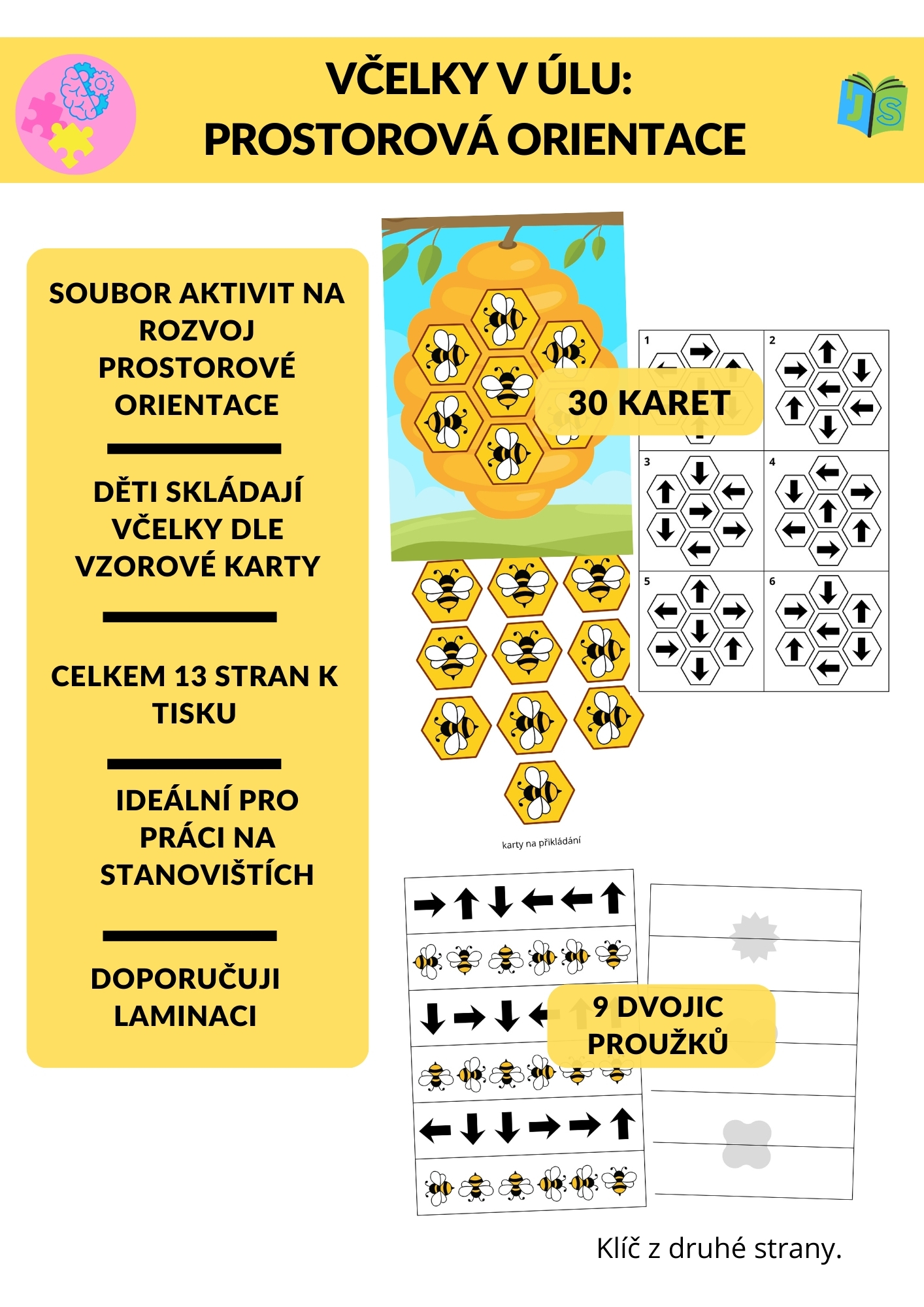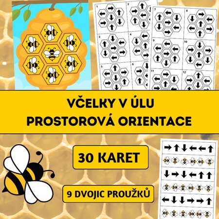 Soubor obsahuje 30 unikátních vzorových karet, na kterých děti sledují kombinace směrových šipek a podle nich vybírají správně orientované včelky do včelího úlu (7 políček). Aktivita podporuje systematické myšlení, koncentraci i přesnost při práci podle předlohy.