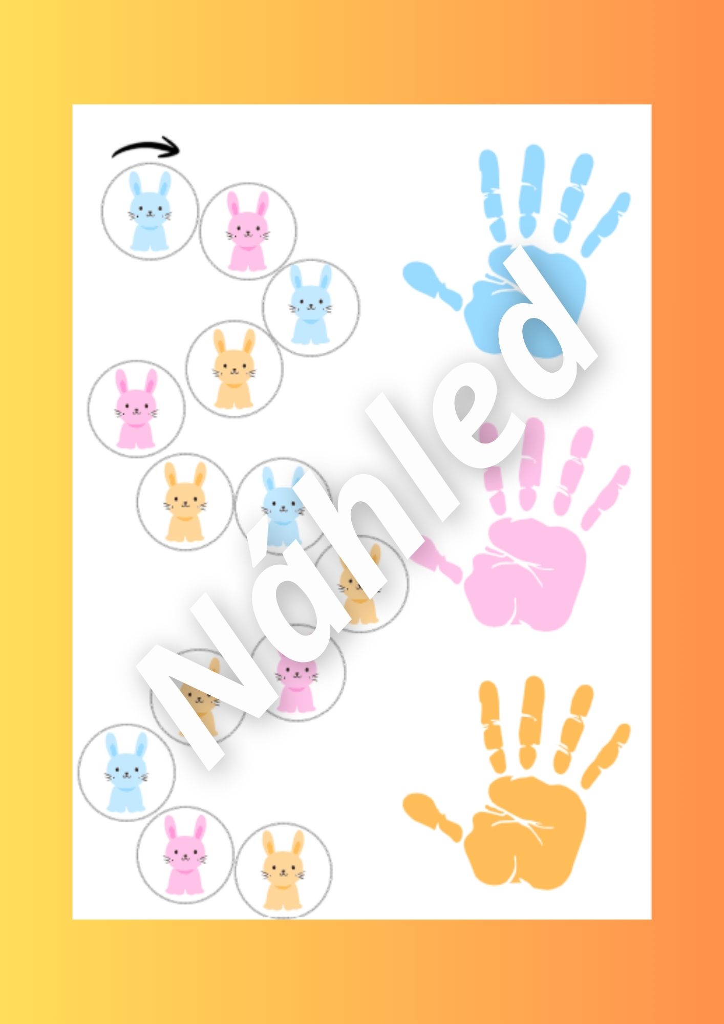 - Propojení hemisfér (str. 50-51) - dítě jedním prstem ukazuje na kytičky a druhou rukou podle barvy kytičky přikládá dlaň na odpovídající barevný otisk